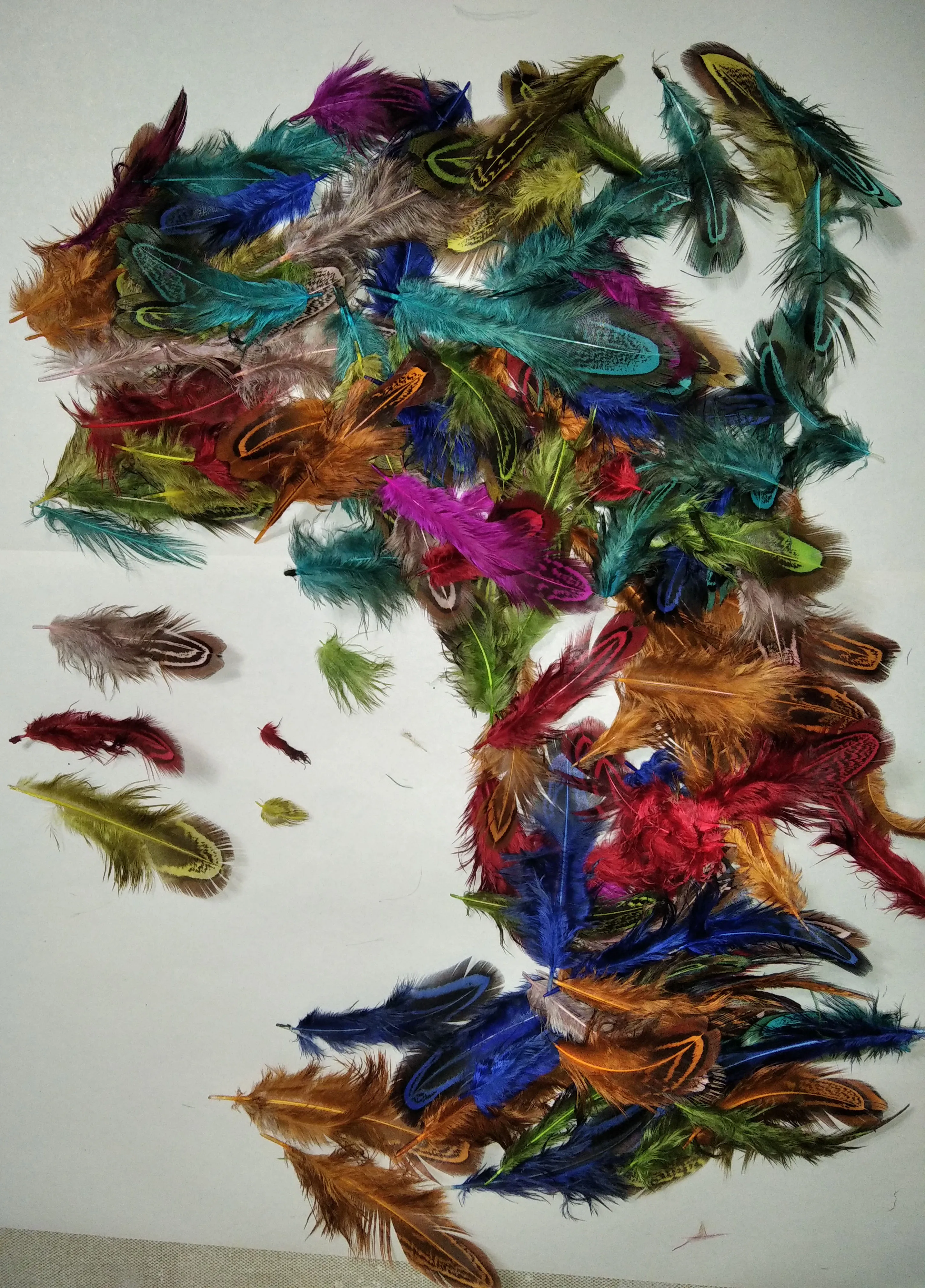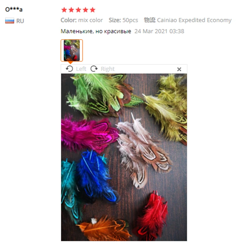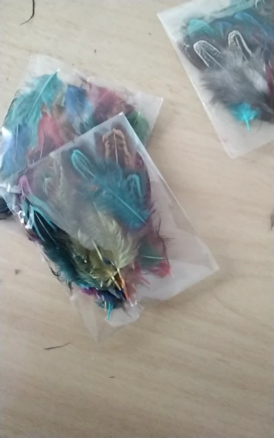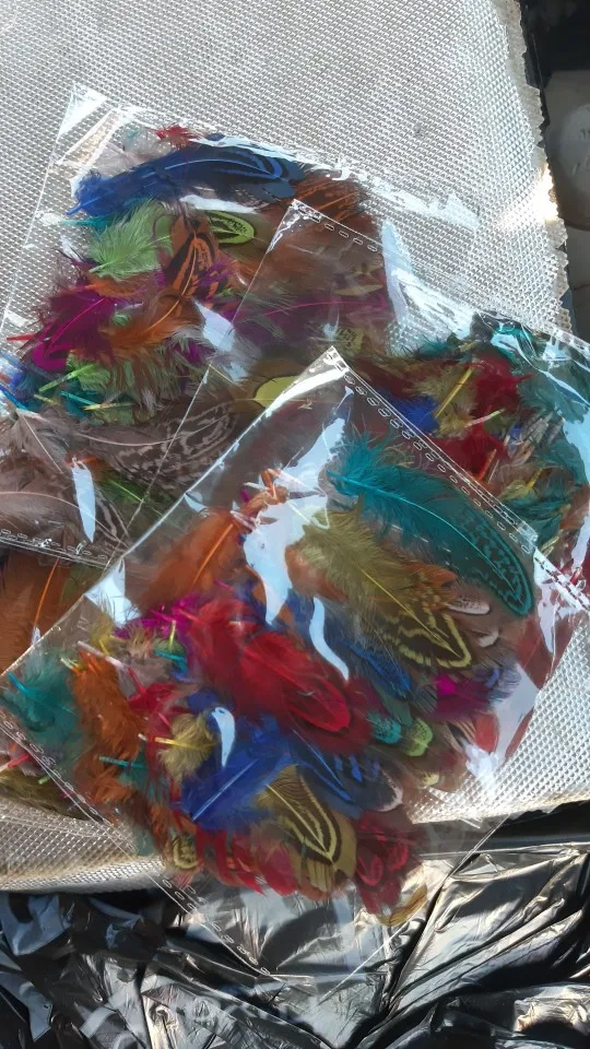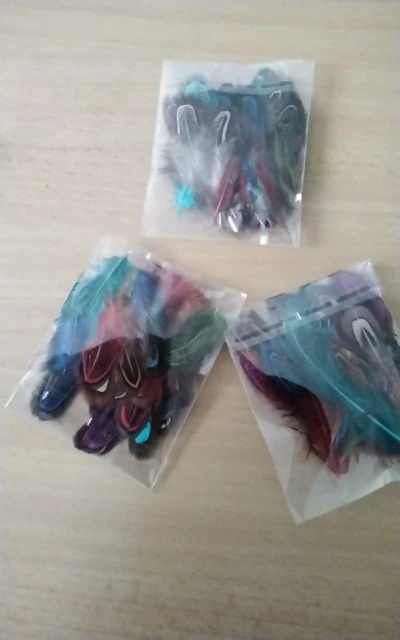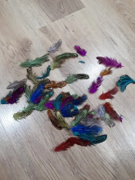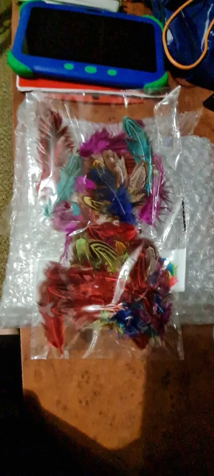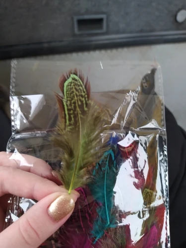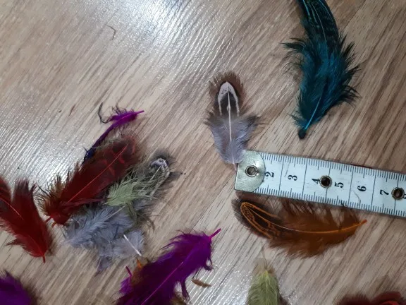 качество перьев неплохое, цвета хорошие. Но размер меньше заявленного, от 4 до 9 сантиметров. Но видимо размер решили компенсировать количеством - заказывала 100 штук, а в пакете было 130 штук. Также при вскрытии был какой-то запах, но он быстро выветрился.