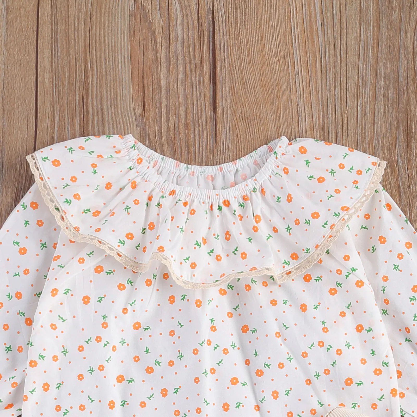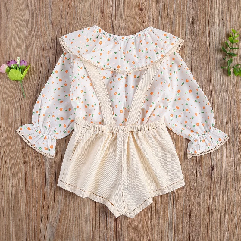 Комплект одежды для маленьких девочек из 2 предметов, рубашка с оборками и круглым вырезом для девочек, однотонный комбинезон на пуговицах с цветочным принтом и листьями
