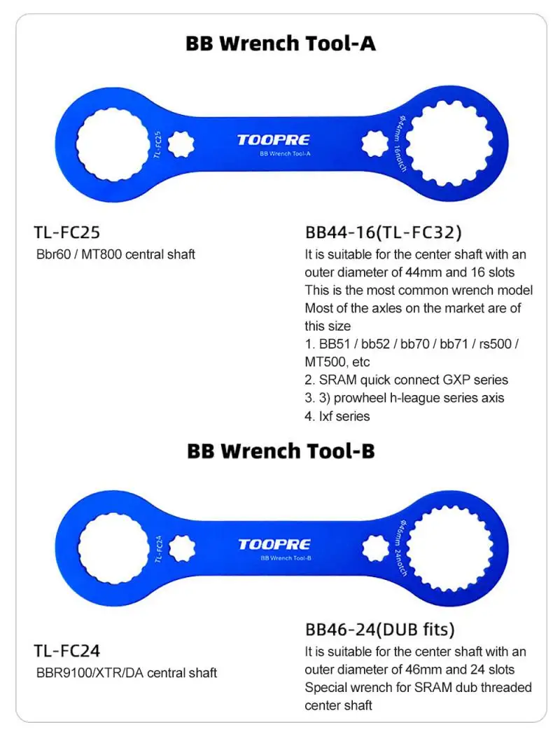 Инструмент A: подходит для использования нижнего кронштейна с внешним диаметром 44 мм и 16 зажимами. Эта модель является наиболее распространенной спецификацией нижнего кронштейна. (BB51/BB52/BB70/BB71BBR60/MT800/RS500/MT500 и т. д.)