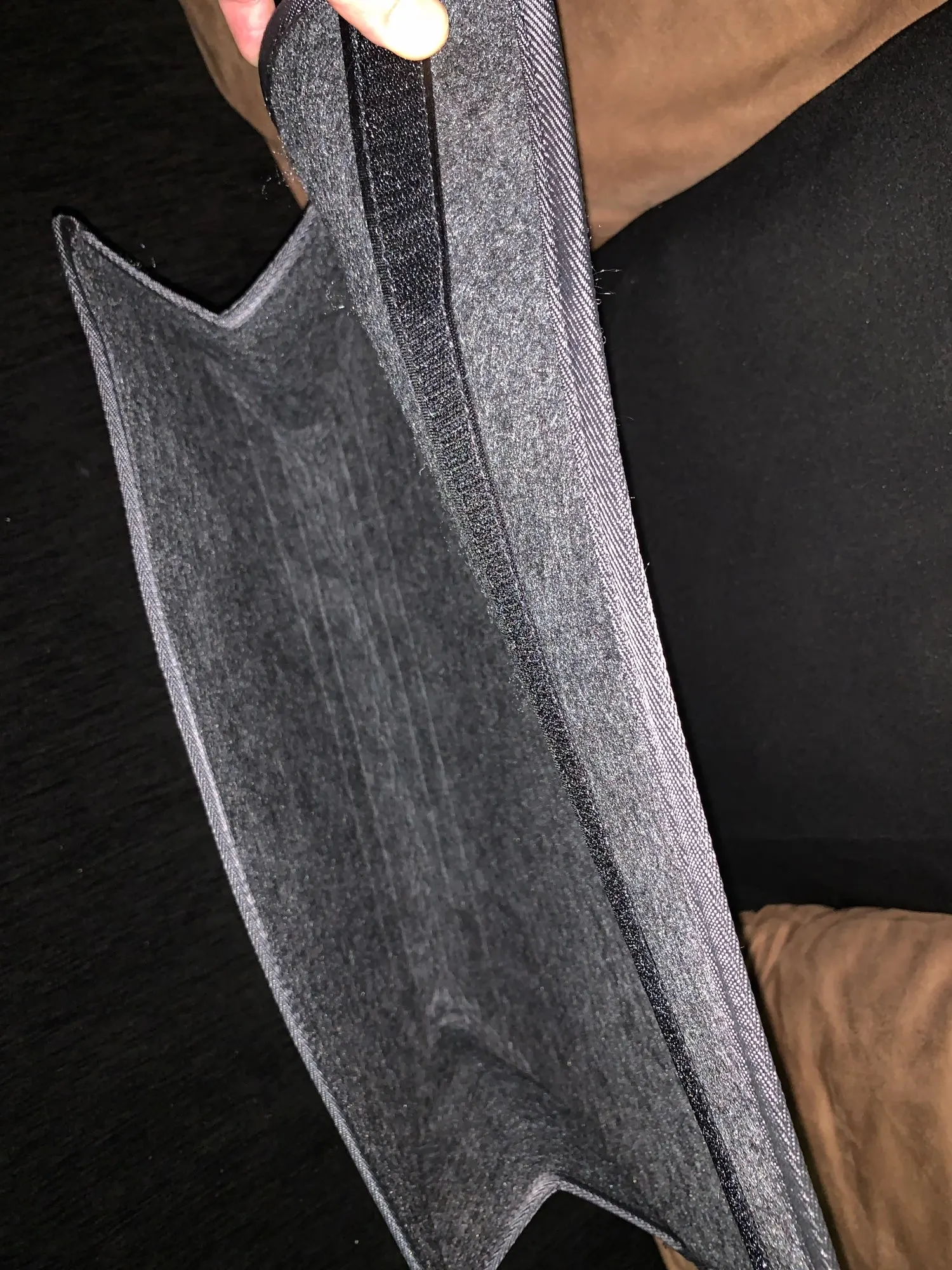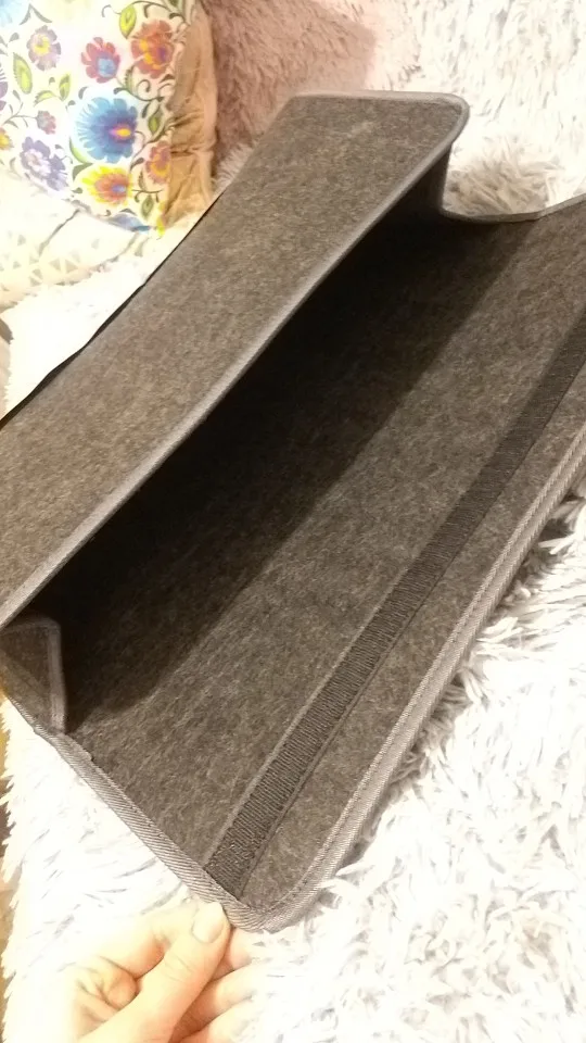 приятный войлочный материал, есть липучки снизу и на задней стенке. Дошло за 3 недели
