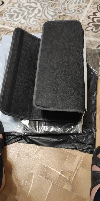 Доставлена в плоском и помятом виде. Долго выпрямлял. Материал мягкий. Сзади и снизу есть полосы "липучек". Для порядка в багажнике автомобиля подойдёт.