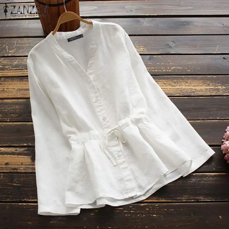 Блузка ZANZEA Женская в винтажном стиле, повседневная рубашки с завязками блузка с длинным рукавом, топ с V-образным вырезом, оверсайз, осень 2021