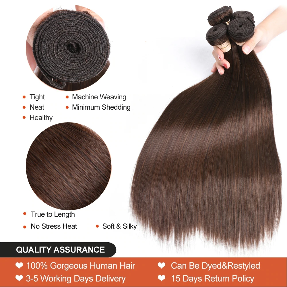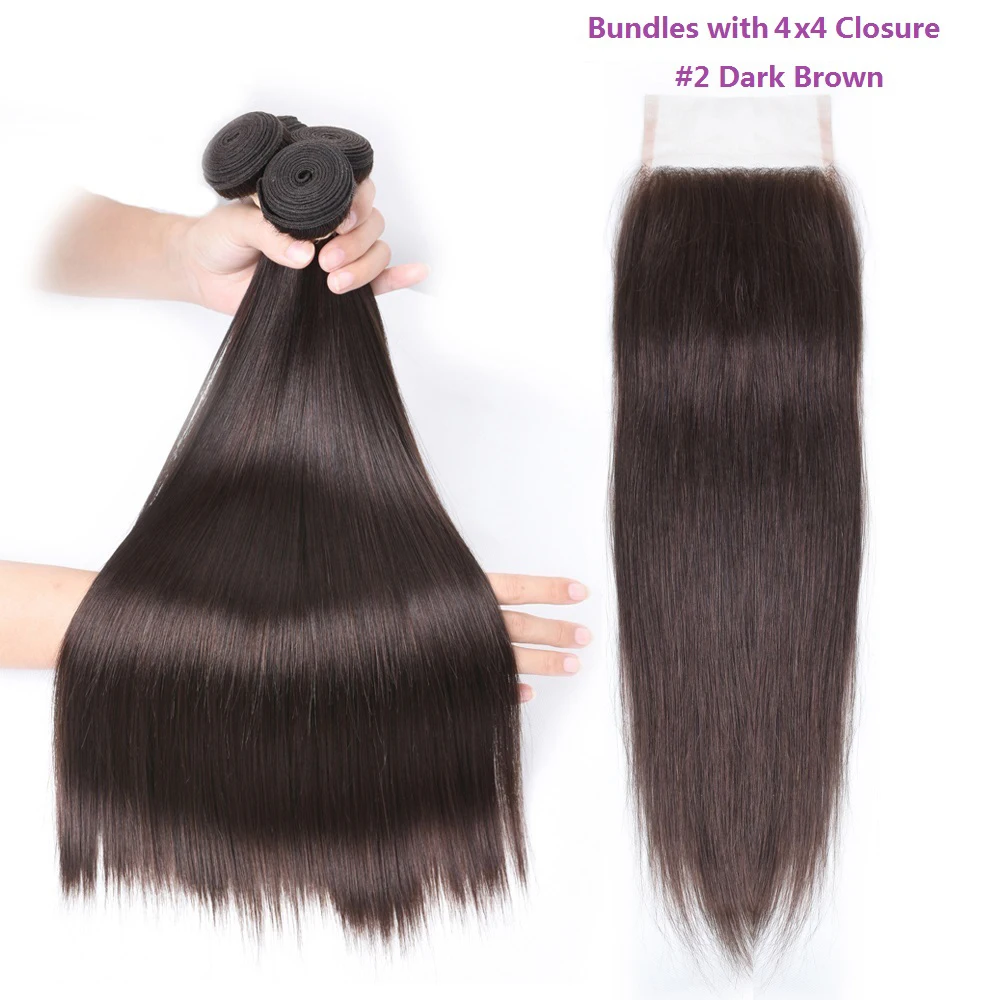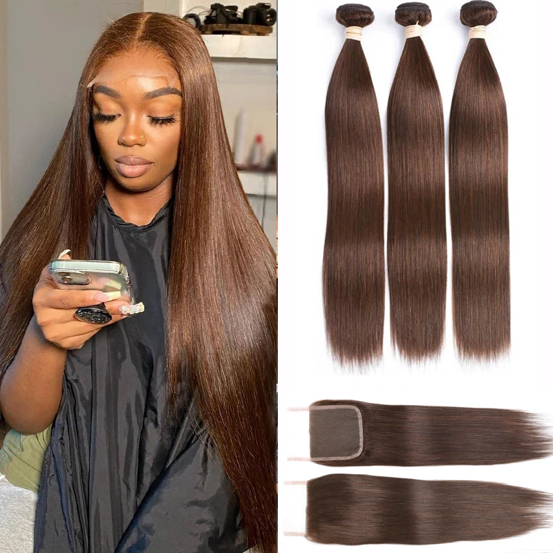 Прямые волосы, 3 пряди, человеческие волосы Remy для наращивания с кружевной застежкой 4x4, #2 #4, коричнепряди с кружевной застежкой