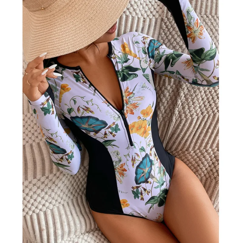 Женский сплошной купальник с длинным рукавом, белый