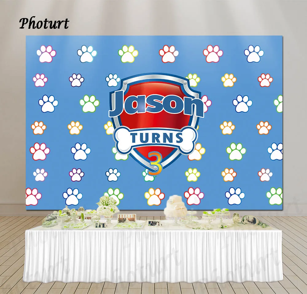 Фон для фотосъемки с изображением лапы мультяшной собаки мальчика 1-й День Рождения фотография фон синий красочный баннер на заказ виниловый фото стенд реквизит