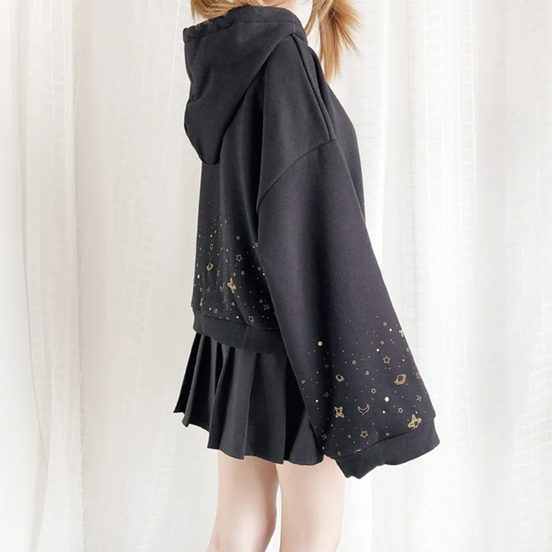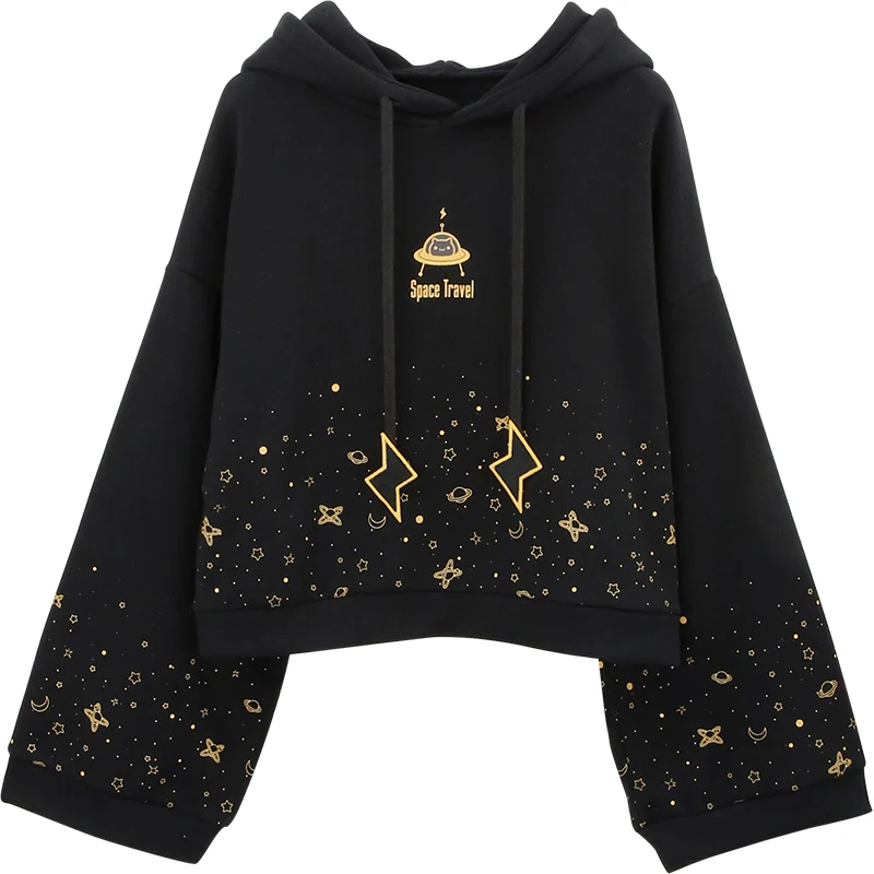 Осенняя Женская Короткая Толстовка в стиле Харадзюку, с расклешенным длинным рукавом, принтом звездного неба, молнией, вышивкой, капюшоном и шнурком