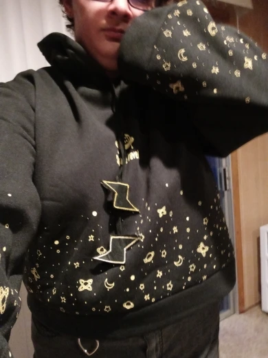 клёвая кофточка, звёздочки на ткани и вообще весь рисунок это не наклейка а принт, что прекрасно. кофточка не длинная, идёт чуть ниже, чем до талии, с высокими джинсами идеально. выглядит, как и на фото продавца