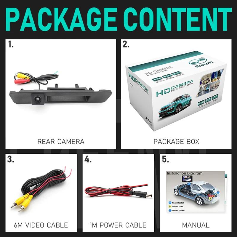1. Задняя камера2. Коробка для посылка3. Видео кабель (6 м)4. Кабель питания5. Руководство пользователя