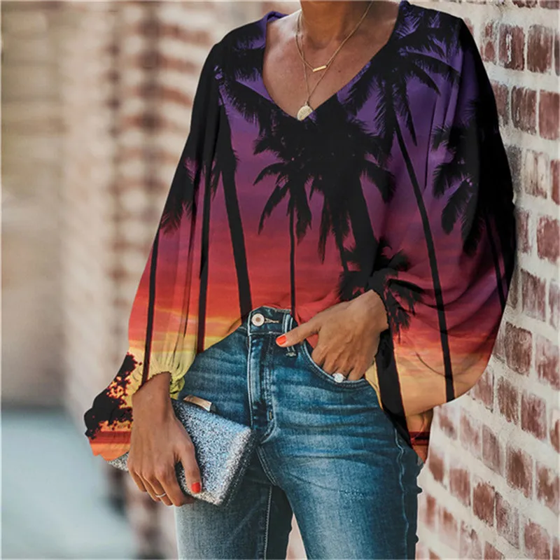 Блузка женская с глубоким вырезом, цветная рубашка с принтом тропического кокосового дерева, свободный Гладкий Шелковый топ с рукавами-фонариками, с V-образным вырезом