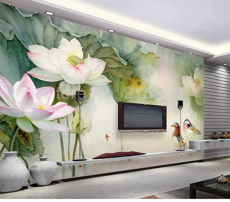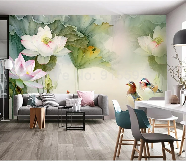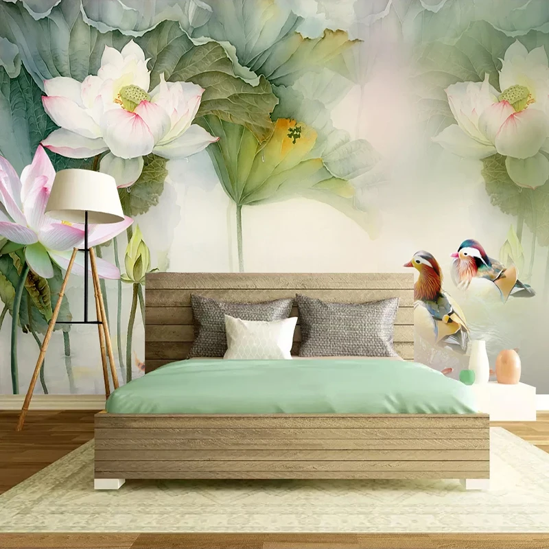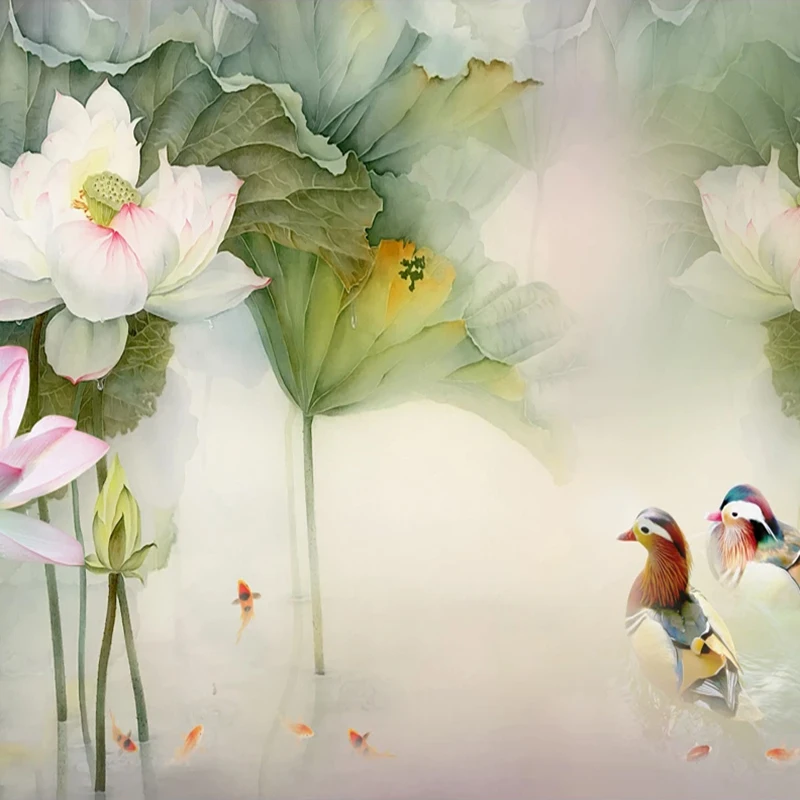 Пользовательские водонепроницаемые холщовые 3D Настенные обои, цветок, утка, лотос, китайский стиль, картина маслом, спальня, гостиная, фон для телевизора
