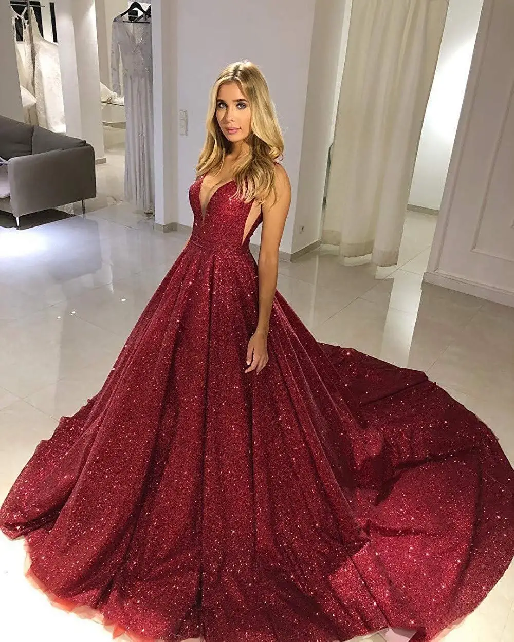 Блестящие бордовые вечерние платья с блестками, вечернее платье с открытой спиной, бальное платье с V-образным вырезом, элегантные платья для женщин