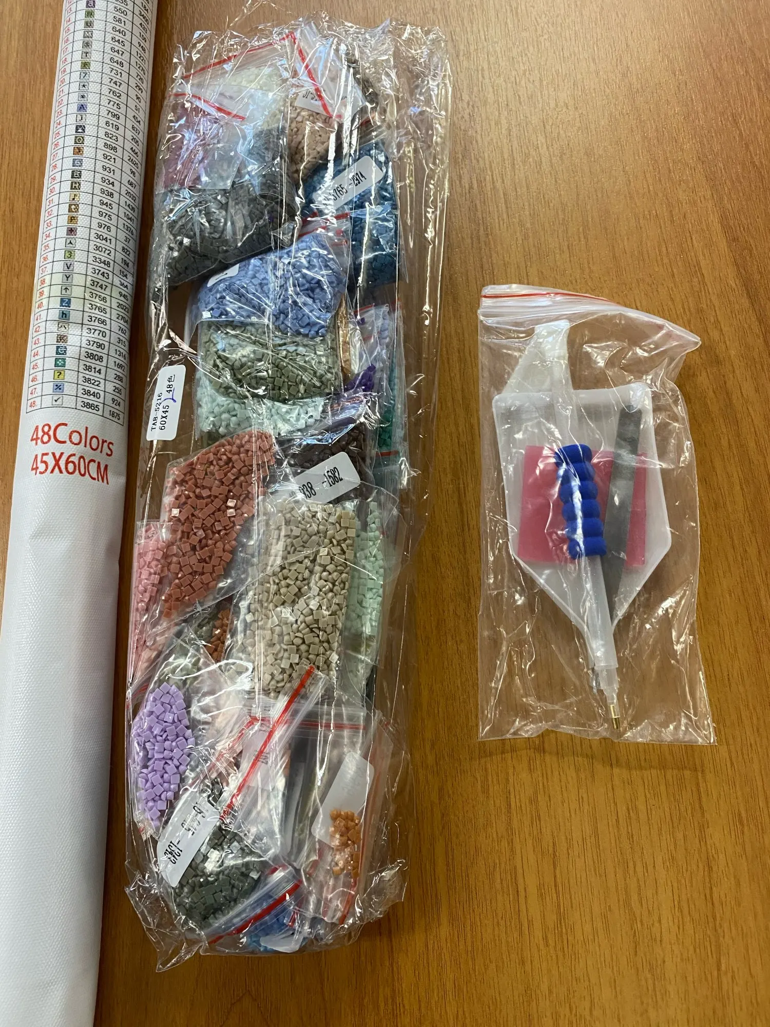 Доставка быстрая, были ещё заказы с других магазинов, все упаковали в одну посылку. Трек отслеживался. Стазы квадратные, все в наличии номера. По количеству думаю хватит. Каждый номер упакован в зиппакетик и подписан!!! Что является большим плюсом!!! Упакована картина отлично, свёрнута на валик поролоновый. Так же наборчик для работы, пинцет, стилус, клей, тарелочка. Картина 45х60, 48 оттенков.