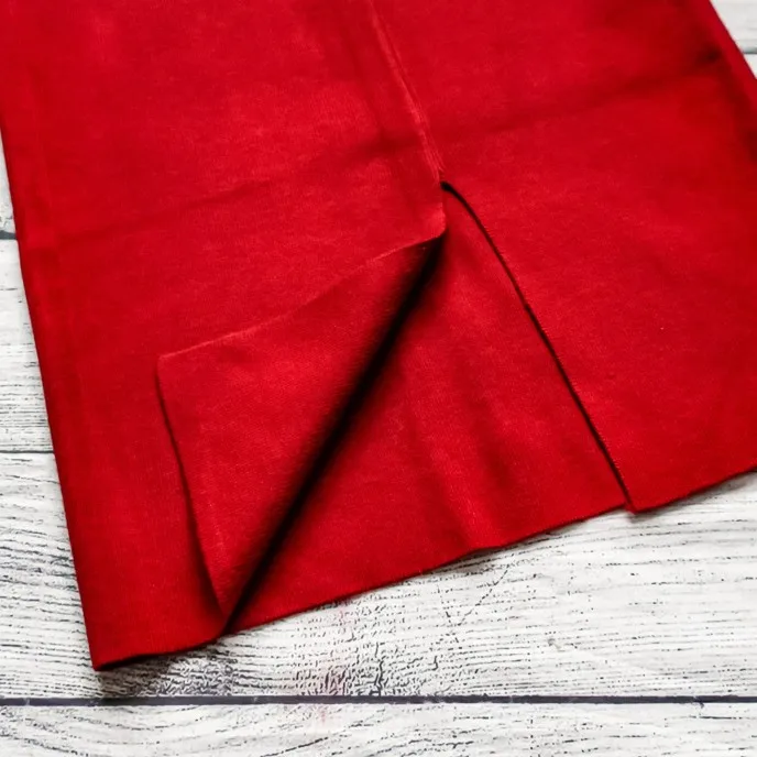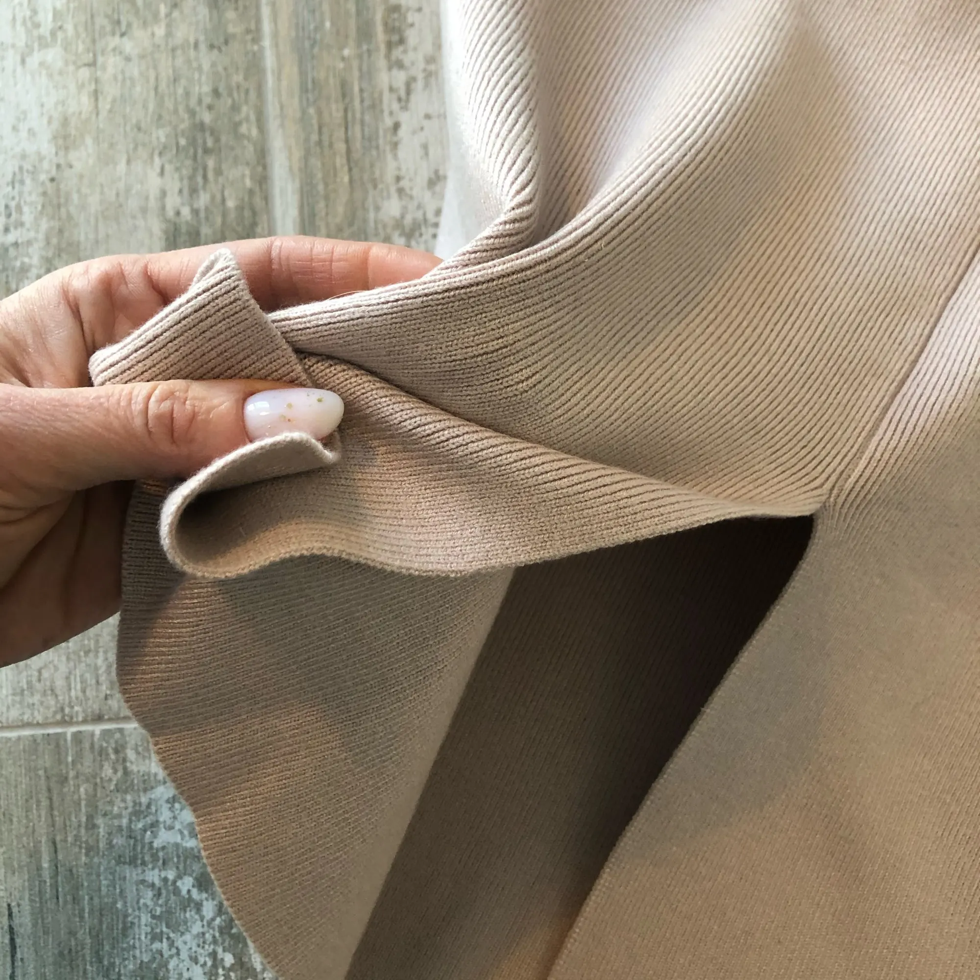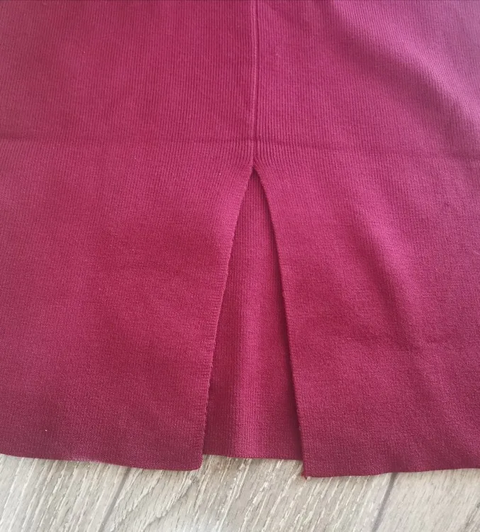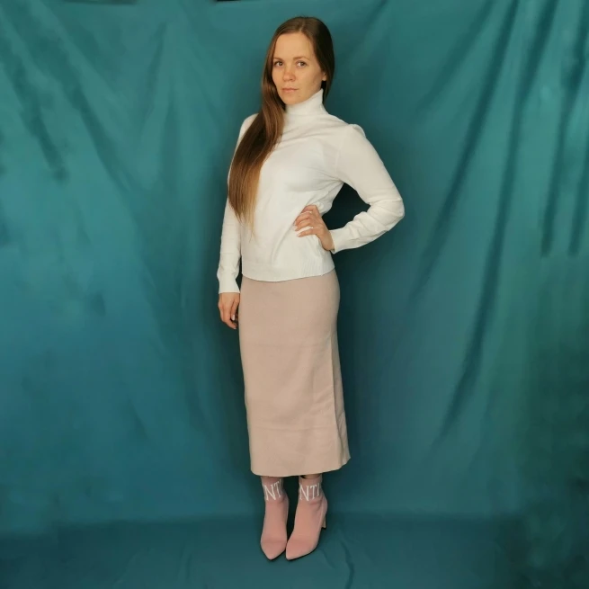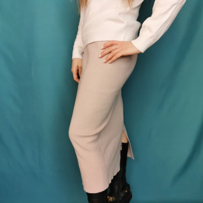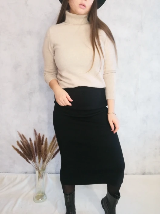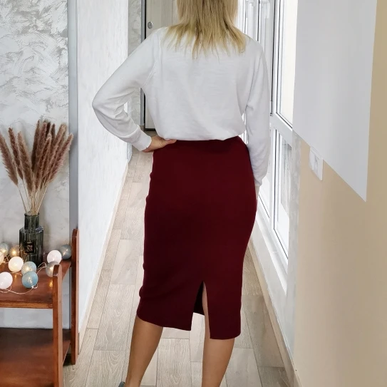 На параметры 85-65-90 и рост 173 см., выбрала размер М. Как села юбка мне понравилось. На мой рост длина изделия чуть ниже колен. Вязка плотная, машинная. Трикотаж на ощупь мягкий, хорошо тянется. Изделие без молнии, на талии держится за счет широкой эластичной ленты. На спинке имеется разрез для удобства при ходьбе.