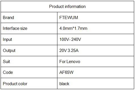 Зарядное устройство FTEWUM для ноутбука, 20 в, 4,0 А, 65 Вт, 1,7*100 мм