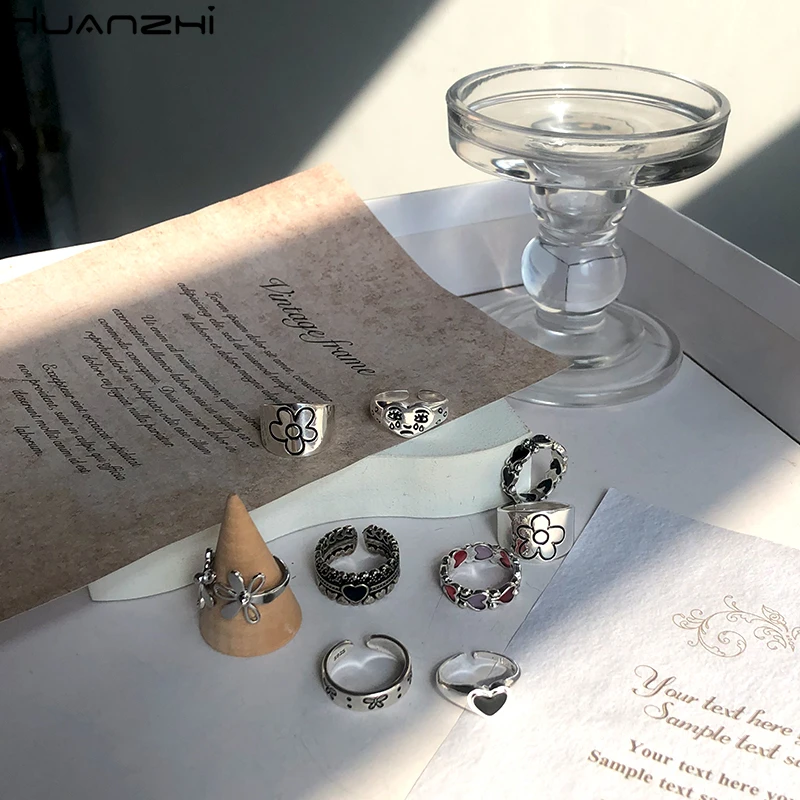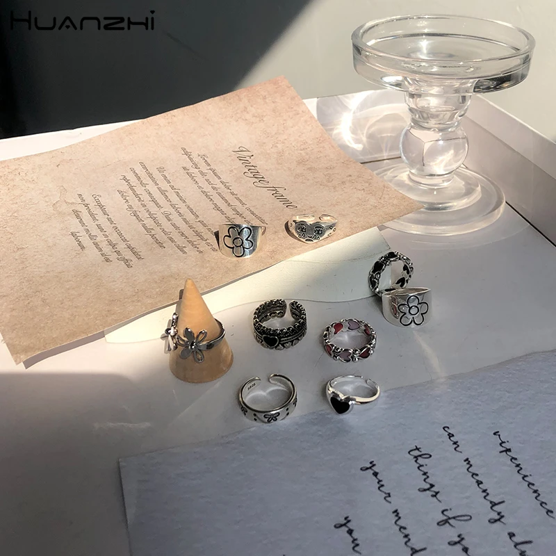 HUANZHI 2020 Новые Модные металлические кольца с глазурью в форме сердца полые цветочные винтажные кольца для женщин и девушек подарочные украшения