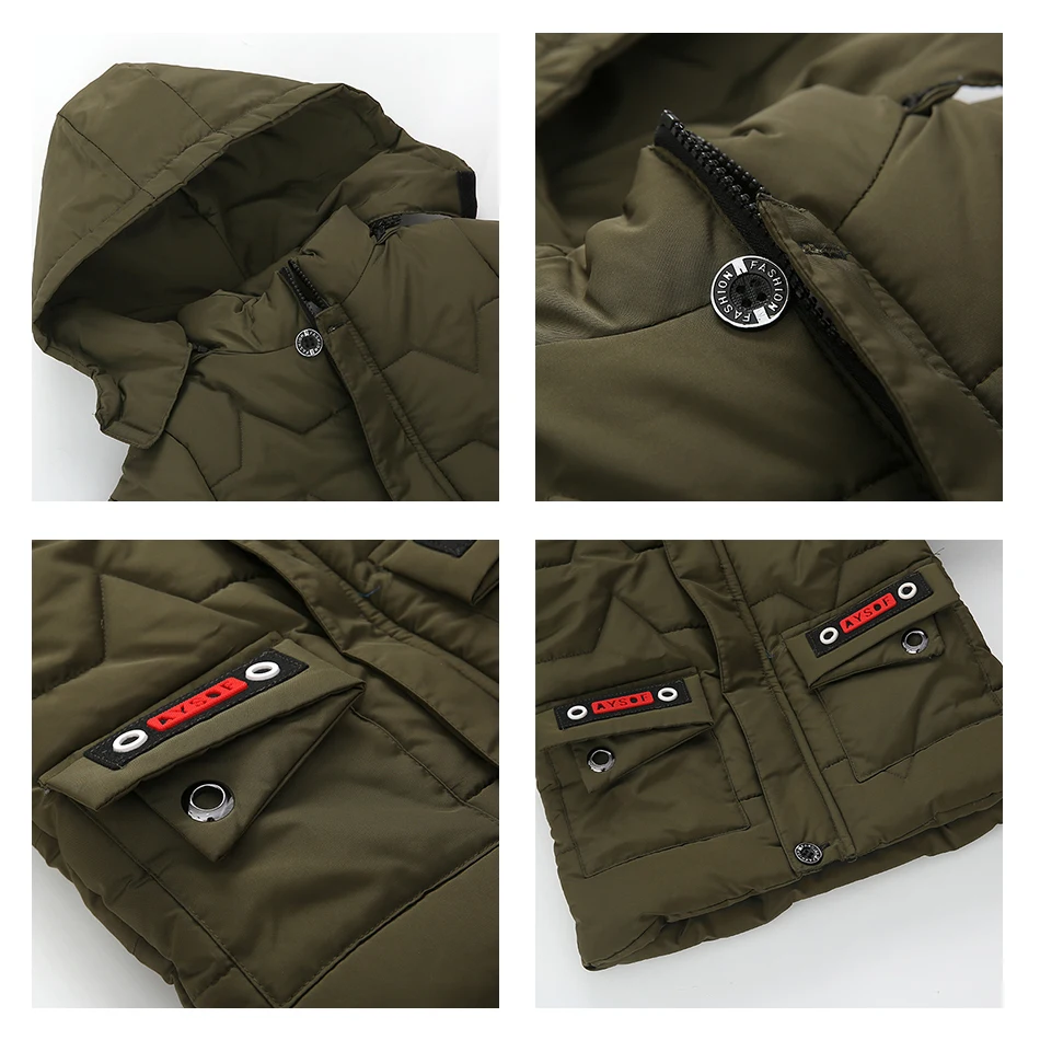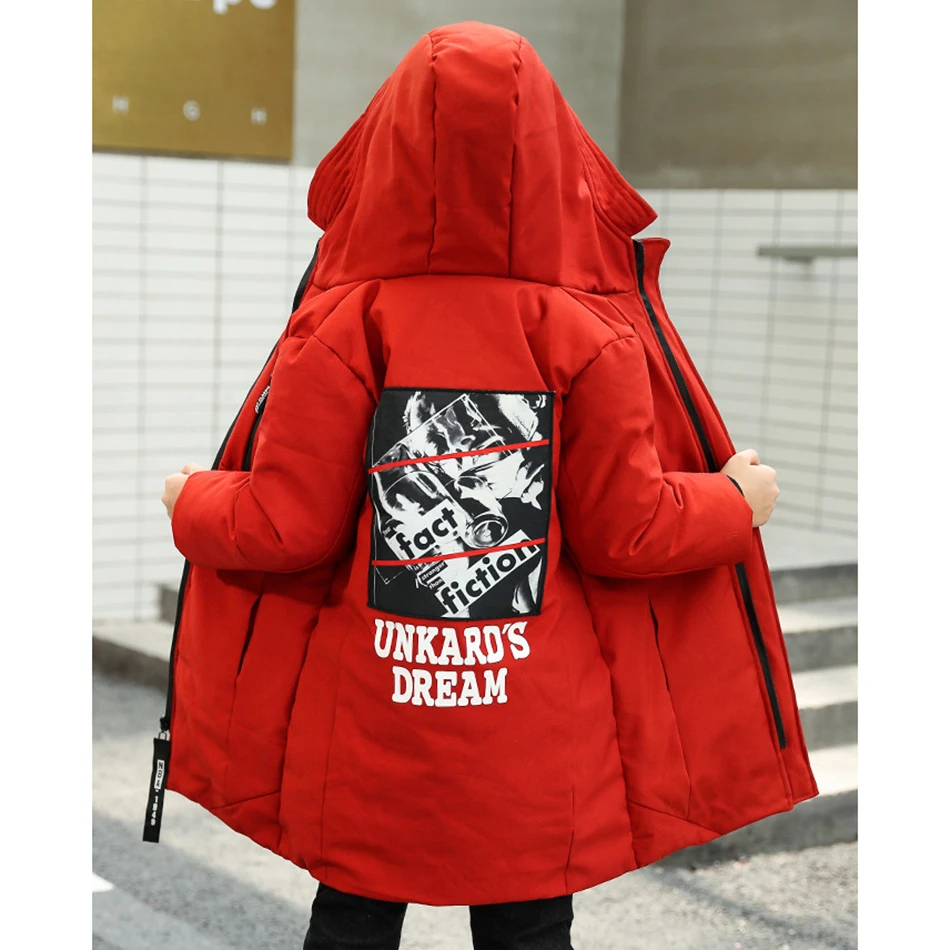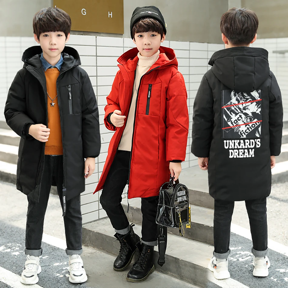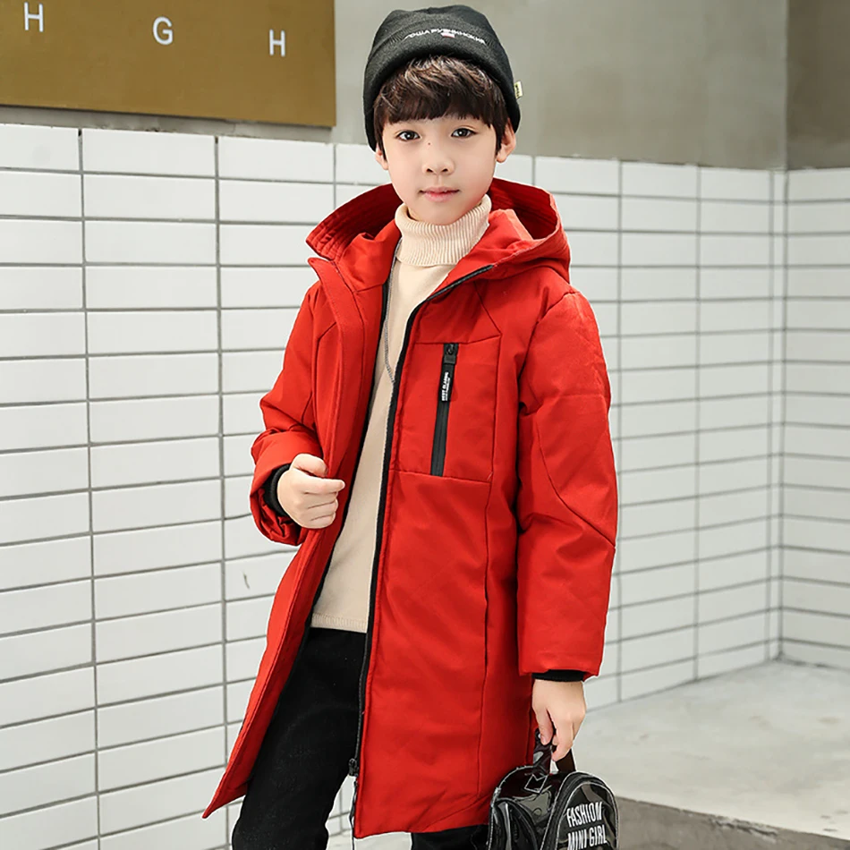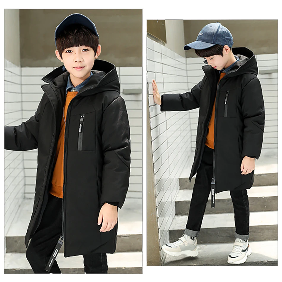 Утолщенная теплая Длинная Верхняя одежда и куртка, пальто для мальчиков, одежда, пальто с капюшоном, зимняя детская пуховая длинная куртка на молнии, пальто