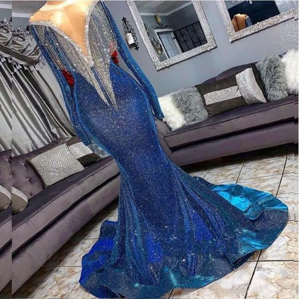 Bling Королевский синий Длинные вечерние платья 2021 Длинные рукава бисером кристаллы платья для выпускного Дубай Формальные Вечерние платья