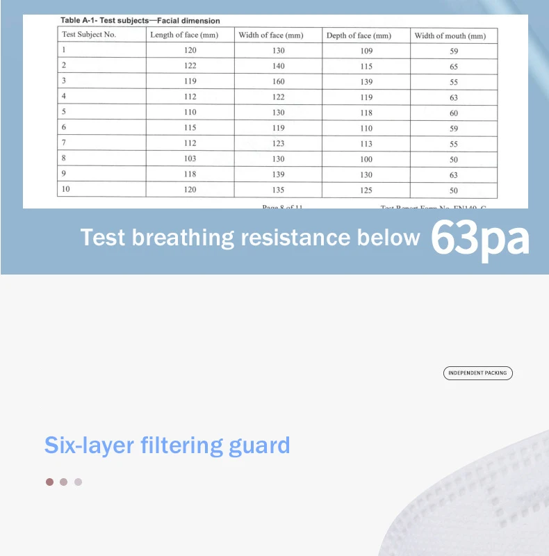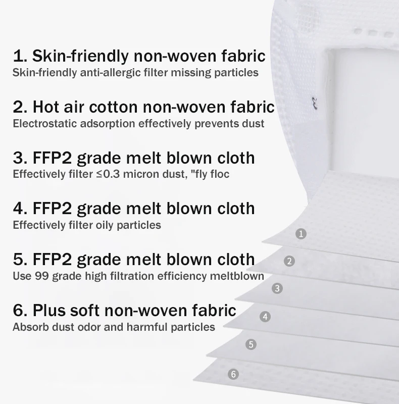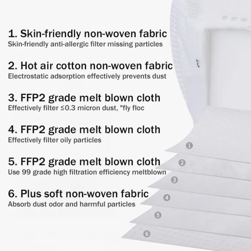 Название: маска FFP2Материал: Нетканая мелтдутая тканьРазмеры: 10,5*15 смПрименимый Предмет: взрослыеСтиль маски: тип подъемного ухаЭффект фильтрации: 95%Толщина: пять слоевУровень защиты: FFP2 Уровень 2Функция: пылезащитный и антизапотевающий Область применения:Страхование труда/Работа/уличная пыль/много людей/велосипеды/Повседневная жизнь Описание:1. Эта маска дышащая и удобная.2. Он характеризуется хорошим фильтрующим эффектом, который помогает блокировать пыль и мелкие частицы.3. Эластичный дизайн ушного крючка делает его более удобным в носке и не давит на уши.4. Подходит для путешествий, столярных работ.5. Бросьте мусорную корзину после использования.