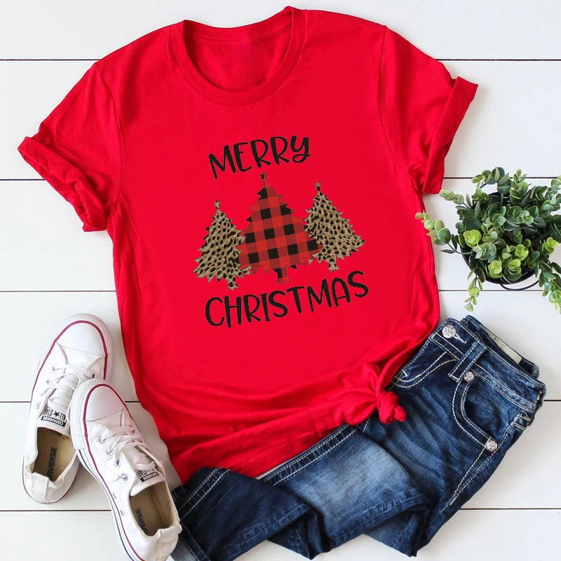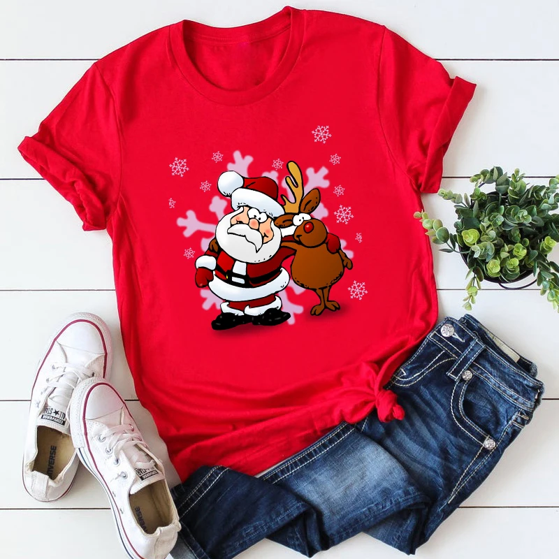 Футболка женская с принтом оленей, Милая Красная рубашка в стиле Харадзюку, модный топ с коротким рукавом для праздника, на Рождество