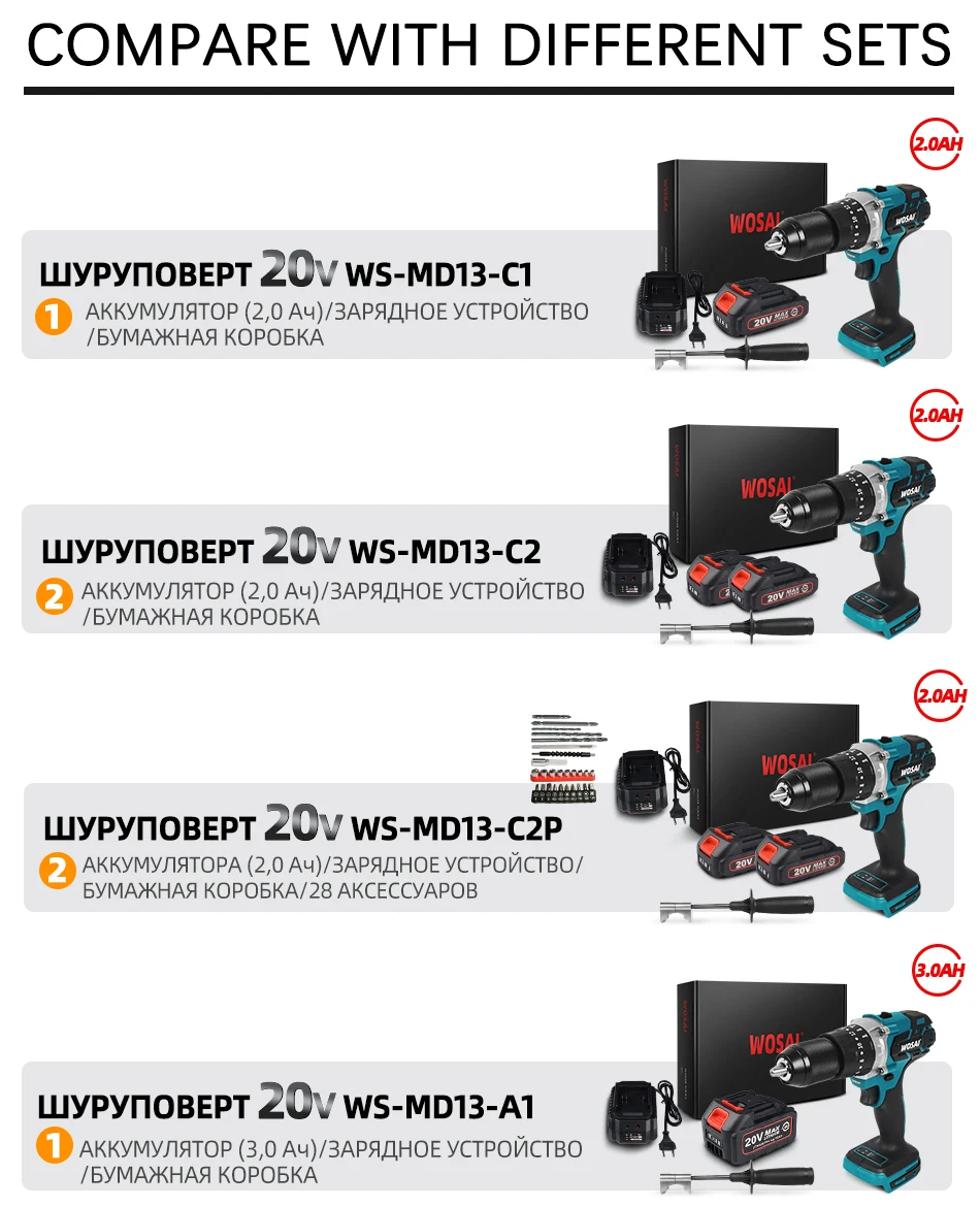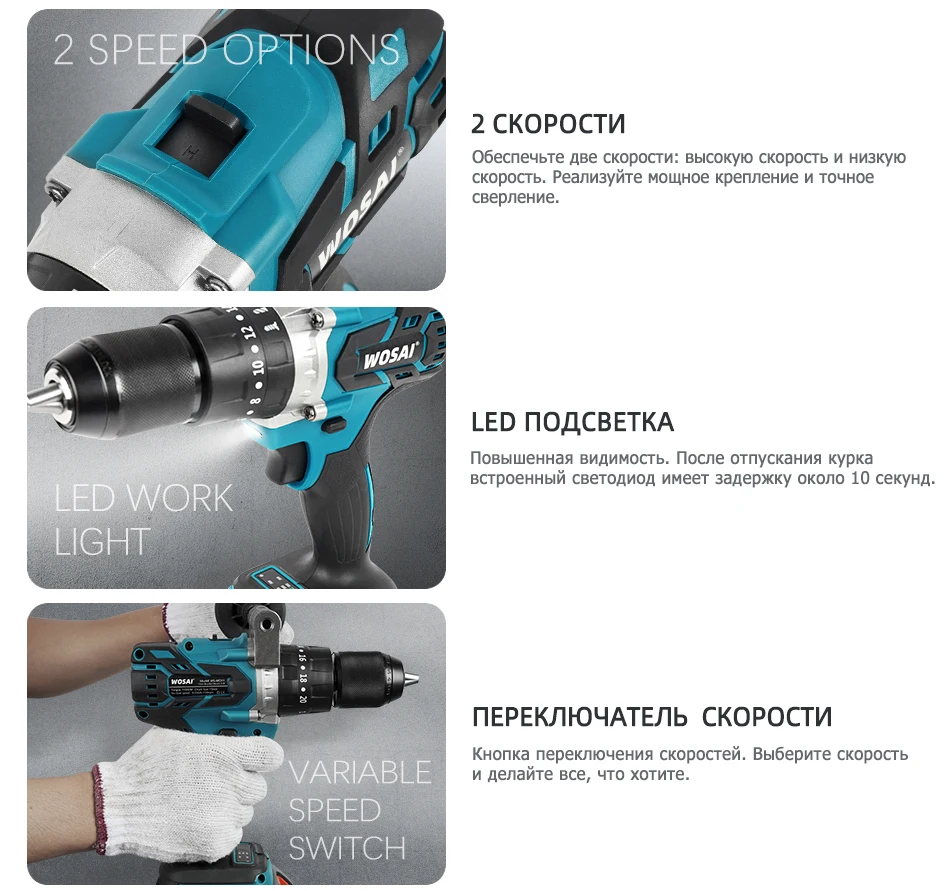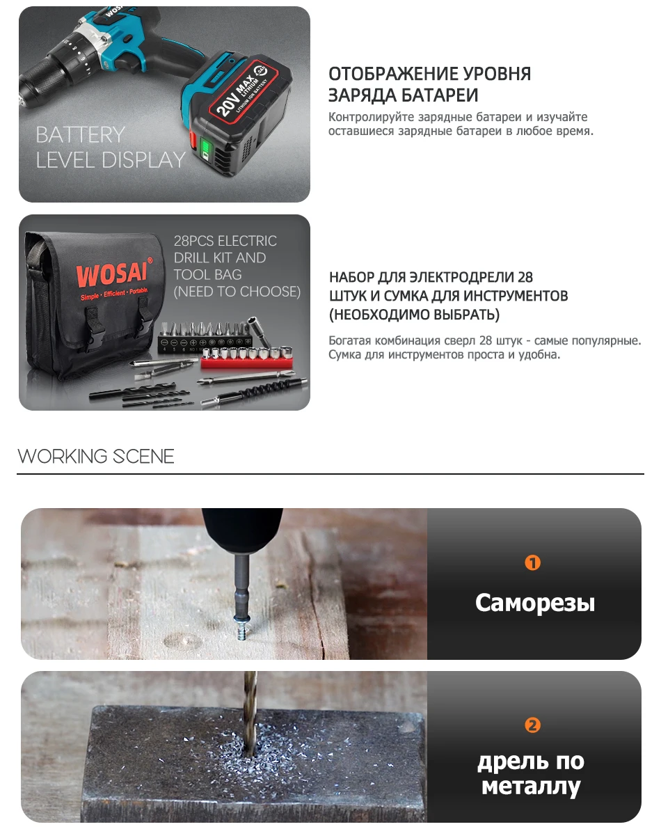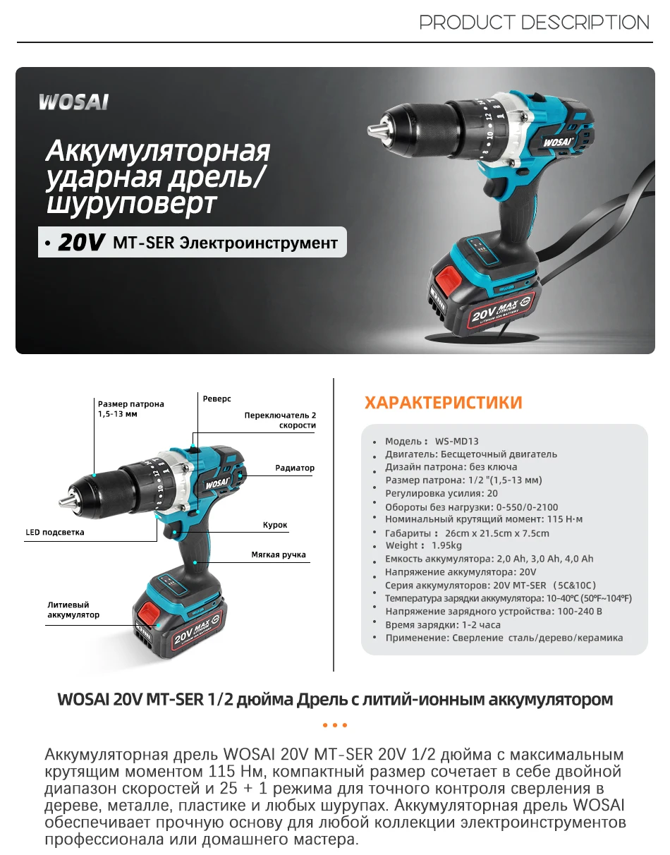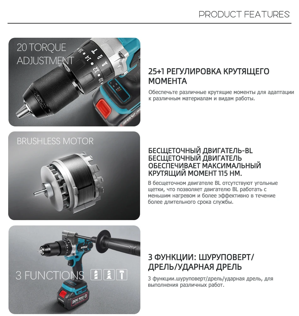 WOSAI 20 в бесщеточная электрическая дрель 20 крутящий момент 115нм Беспроводная отвертка литий-ионная батарея электрическая дрель