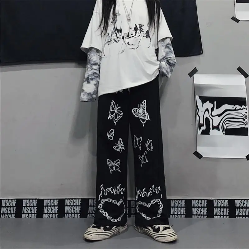 Винтажные широкие брюки HOUZHOU, Зимняя мода 2020, женские брюки с принтом Harajuku, свободные, повседневные, в Корейском стиле, с высокой талией