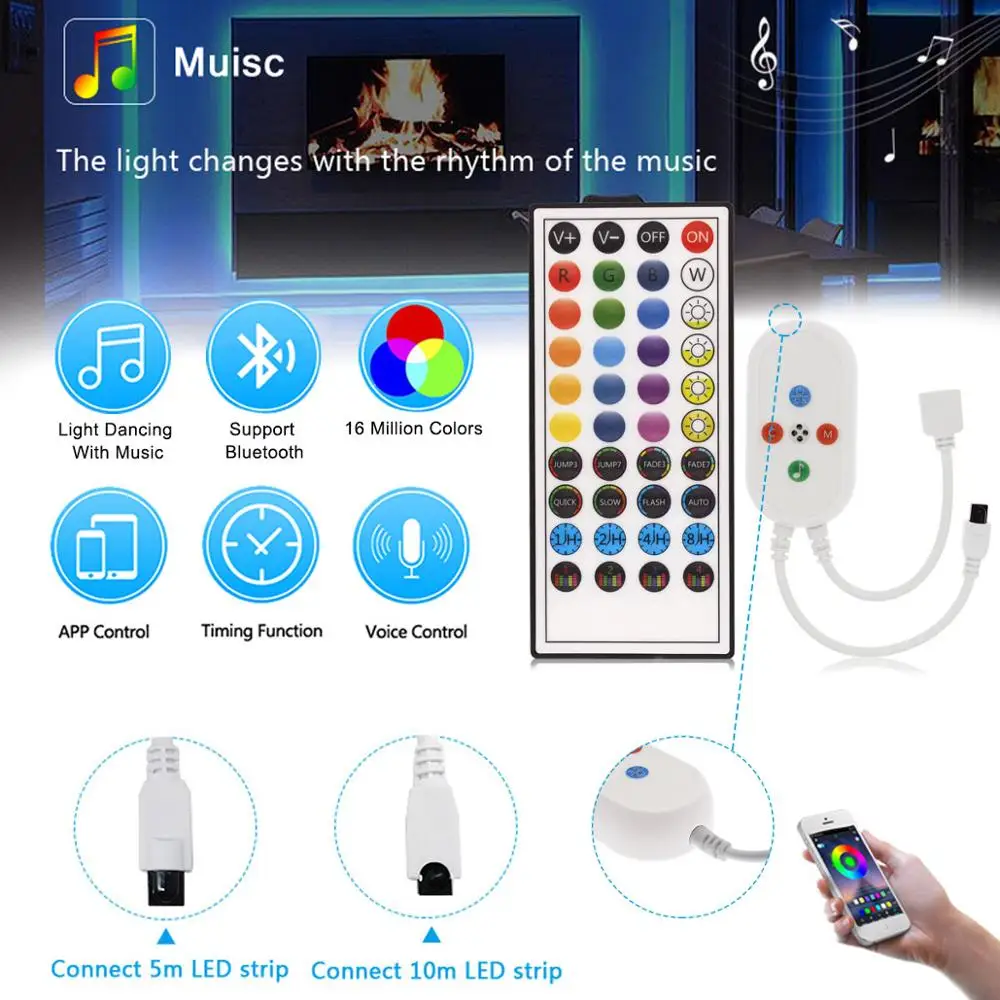 • Светодиодный Тип: SMD 2835 / SMD 5050• Длина: 5 м/10 м/15 м/20 м• Рабочее напряжение: 12 В постоянного тока• Источник питания: 12 В 1A/2A/3A (EU/US/UK/AU)• Уровень водонепроницаемости: не водонепроницаемый• Батарейка контроллера: Bluetooth APP контроллер/24-кнопочный ИК-пульт дистанционного управления (без Батарея)• ИК-пульт дистанционного управления должен выравнивать приемник сигнала• 【Bluetooth контроль Подключение bluetooth, микрофон и музыкальный режим и режим синхронизации, изменение цвета.• Музыкальный режим не проигрывает музыку, просто работает с входом музыки