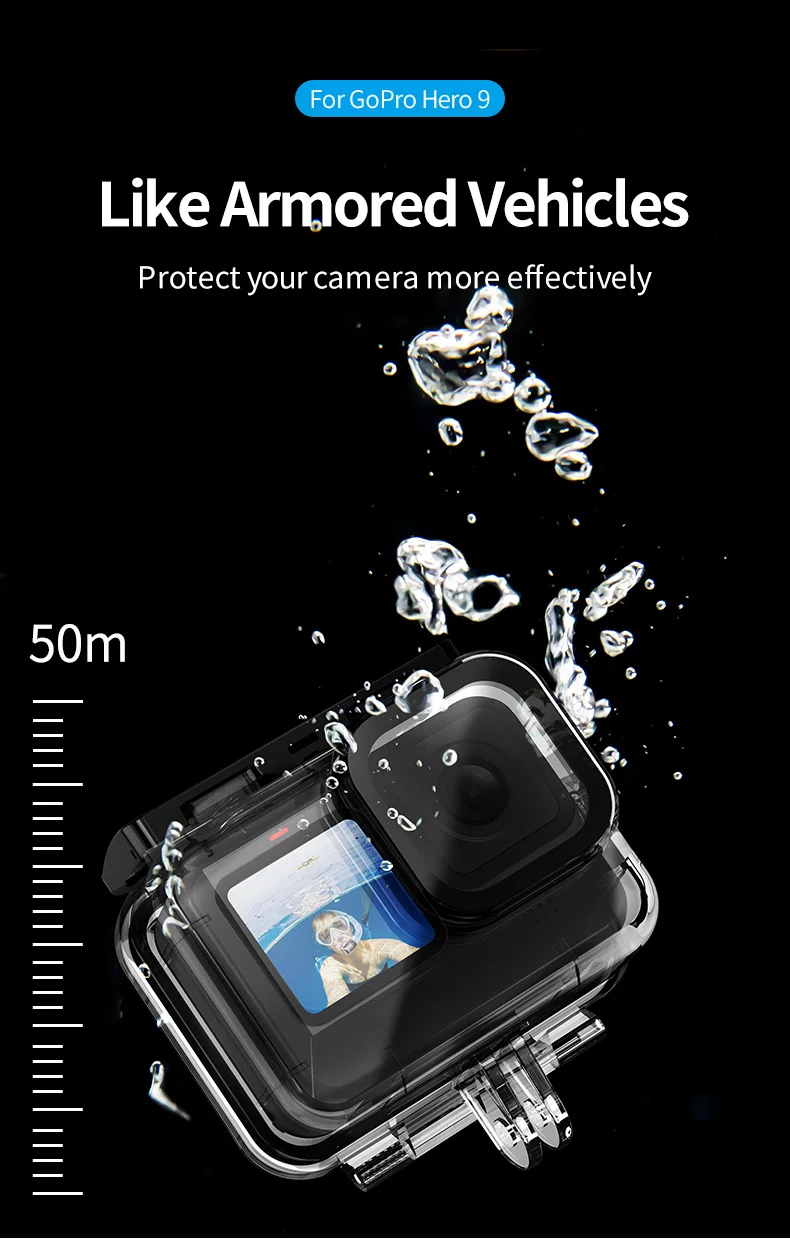 1. Водонепроницаемость до 164фт/50 м. Обеспечивает максимальную четкость изображения выше и под водой.2. С этим водонепроницаемым корпусом вы можете идеально использовать камеру 50 м под водой; Водонепроницаемое покрытие против серфинга не повлияет на ваше движение и фотографический эффект;3. Линзы сделаны из высокоорганического закаленного стекла, могут поддерживать хорошую фотосъемку;4. Подходит для GoPro Hero 9 черной камеры.5. Простота установки не нужно разбирать Дизайн объектива делает его более удобным в использовании водонепроницаемый чехол6. Специальный материал из нержавеющей стали 316, широкая головка кнопки, увеличьте площадь контакта между водонепроницаемой кнопкой-чехол и кнопкой камеры, Защитите кнопку камеры.7.Magenta,fuchsine и фиолетовый фильтр для объектива можно использовать на глубине 5 м-25 м и может исправить отклонение цвета в различном качестве воды.
