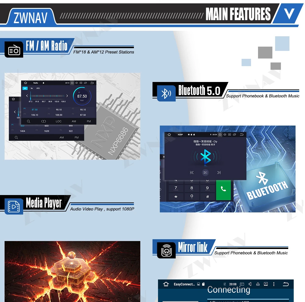 1. Формат видео: поддержка HD 1080P /4K ISP-экрана 2. Разрешение экрана: высокое разрешение, емкостный 5 точек Мультитач, с функцией двойной зоны 3. Беспроводной телефонный звонок по Bluetooth синхронизировать список контактов 4. Встроенная функция WIFI (Используйте точку доступа со смартфона для подключения к Интернету) 5. Встроенное приложение Google Play Store, загрузите нужное приложение. 6. Поддержка автономной карты GPS и онлайн-карты, поддержка карты Google. 7. Радиомикросхема NXP6686, AM / FM с RDS 8. Поддержка аудио AUX-IN, с 2 портами USB 9. Поддержка управления рулевым колесом 10. Язык экранного меню: английский/русский/французский/немецкий/испанский/итальянский/арабский/Португальский/Турецкий/тайский/Польский/иврит, Все 53 языка