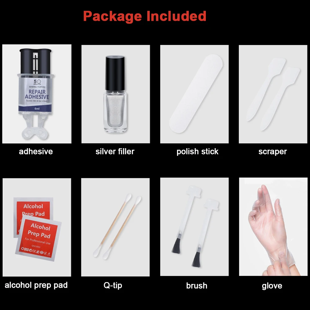 7. Используйте ватный тампон для очистки пролитого клея8. После того, как клей высохнет, нанесите серебряный порошок на поврежденную область, а затем подождите, пока серебряный порошок затвердеет