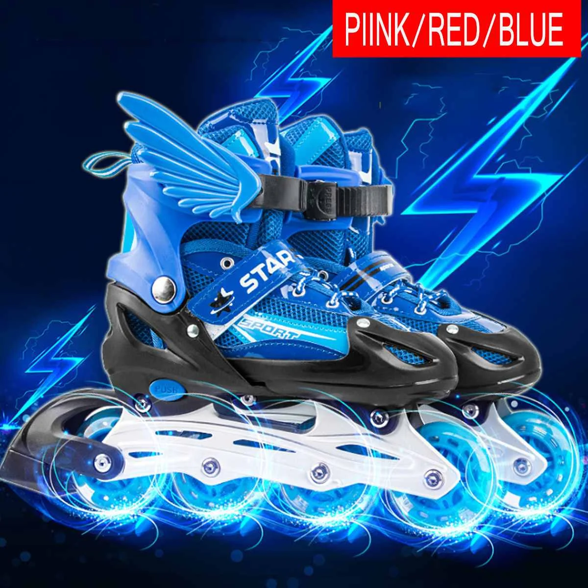 Спецификация: Название продукта: обувь для роликовых коньковМатериал: ПВХ + дышащий жемчужный сетчатый хлопокМатериал колес: полиуретанМатериал кронштейна: алюминиевый сплавМатериал подшипника: подшипник ABEC-7Вес: 2500 гЦвет: розовый/красный/синий (необязательно)Размер: S(26-32)/M(33-37)/L(38-42)(необязательно)Подходящий возраст: 3 +