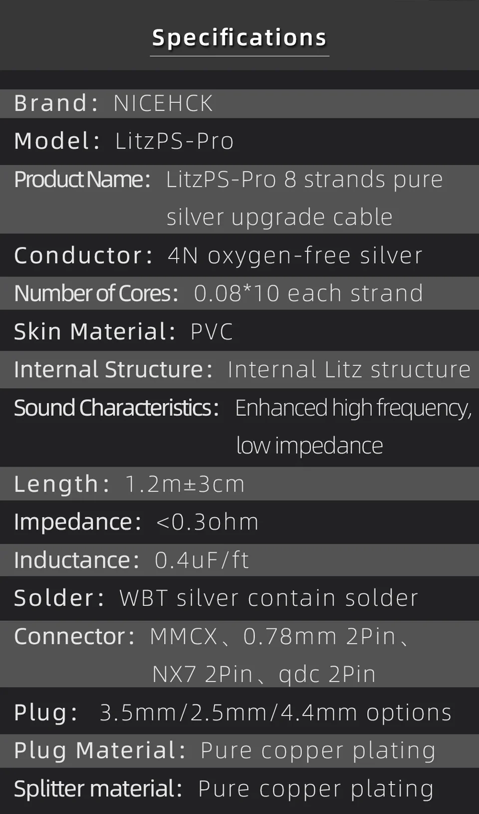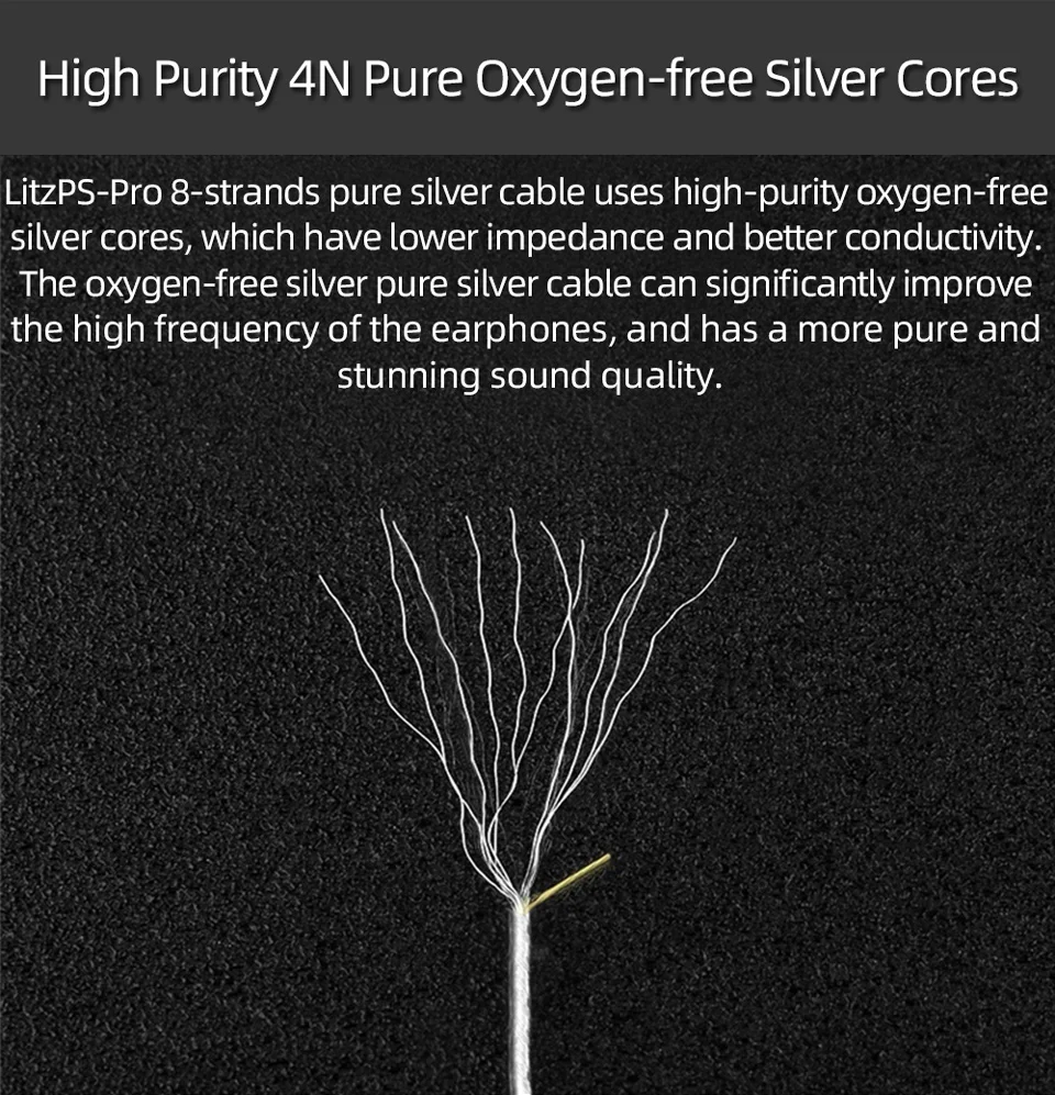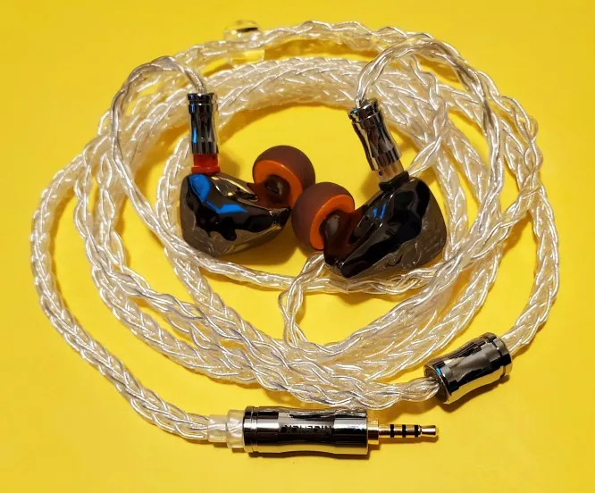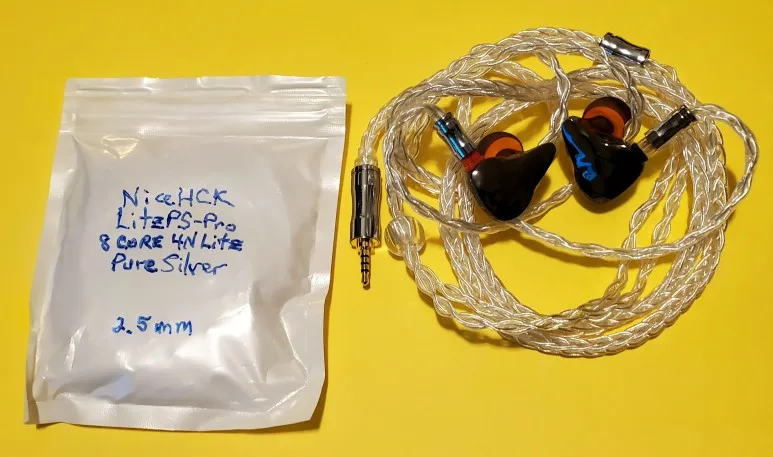 Некоторые люди будут использовать только кабель Litz из-за того, что «чисто» передача сигнала. Поскольку каждая нить из серебра (в этом случае) покрыта полимером, искажение низкое. Это красивый 4N чистый серебристый (99.99%) кабель Litz, один из лучших, что я увидел. Некоторые, как 4-ядерный, предположение о том, что меньше (дамы?) для передачи сигнала. Мне нравится 8-ядерный, потому что он больше, но помните, что это то, что с ним сделано? Кабели IEM имеют мифы и истина о материале, ядре, плетении и т. д. Я думаю, что они добавляют в красоту IEM больше всего, и звуковые различия очень трудно услышать IMHO. На рисунке №3, Tripowin Mele с NiceHCK C16-3 16-жильный медный кабель слева, IKKO OH10 Obsidian с этим кабелем справа. 16 ядер меньше, так как оплетка (не маленькая). Я настоятельно рекомендую этот серебристый кабель! Это не может быть потрачено за цену, но получить его в продаже... 11/11 подходит!