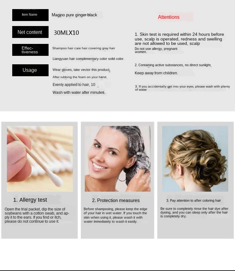 Направление:1. Наденьте перчатки, выдавите достаточное количество крема в миску и хорошо перемешайте2. Быстро впитайте крем в волосы и корень волос, массируйте волосы в течение 8-15 минут3. Белые волосы превращают черные волосы в краску с водой4. Высушите волосы