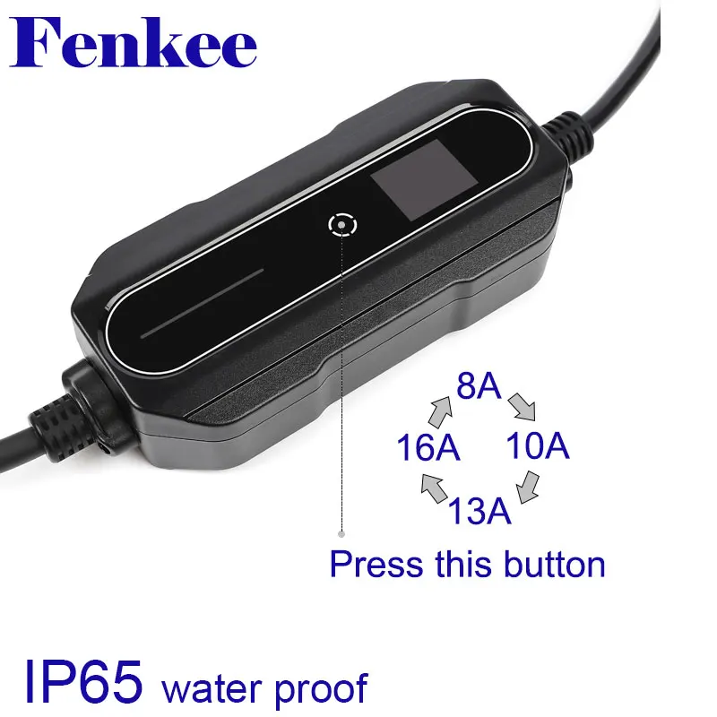 Нажмите кнопку на блоке управления, чтобы изменить ток, прежде чем вставить зарядный разъем в порт автомобиля.