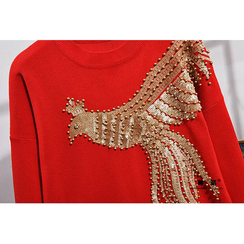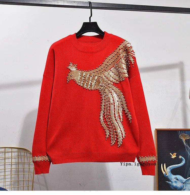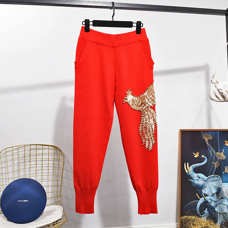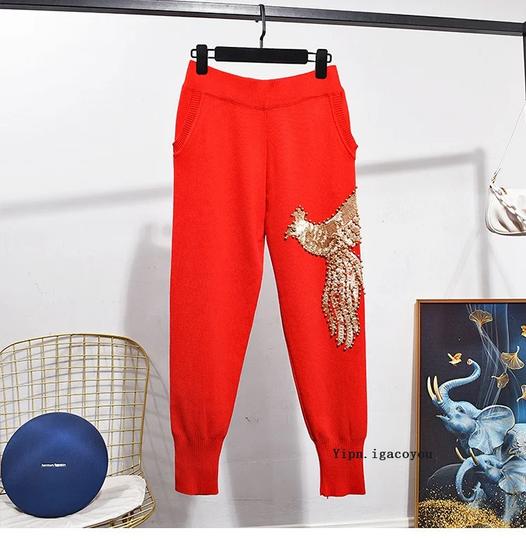 Женский трикотажный комплект из двух предметов, красный, черный, серый, белый свитер с блестками и шаровары с Фениксом, спортивный костюм для женщин, вязаный костюм