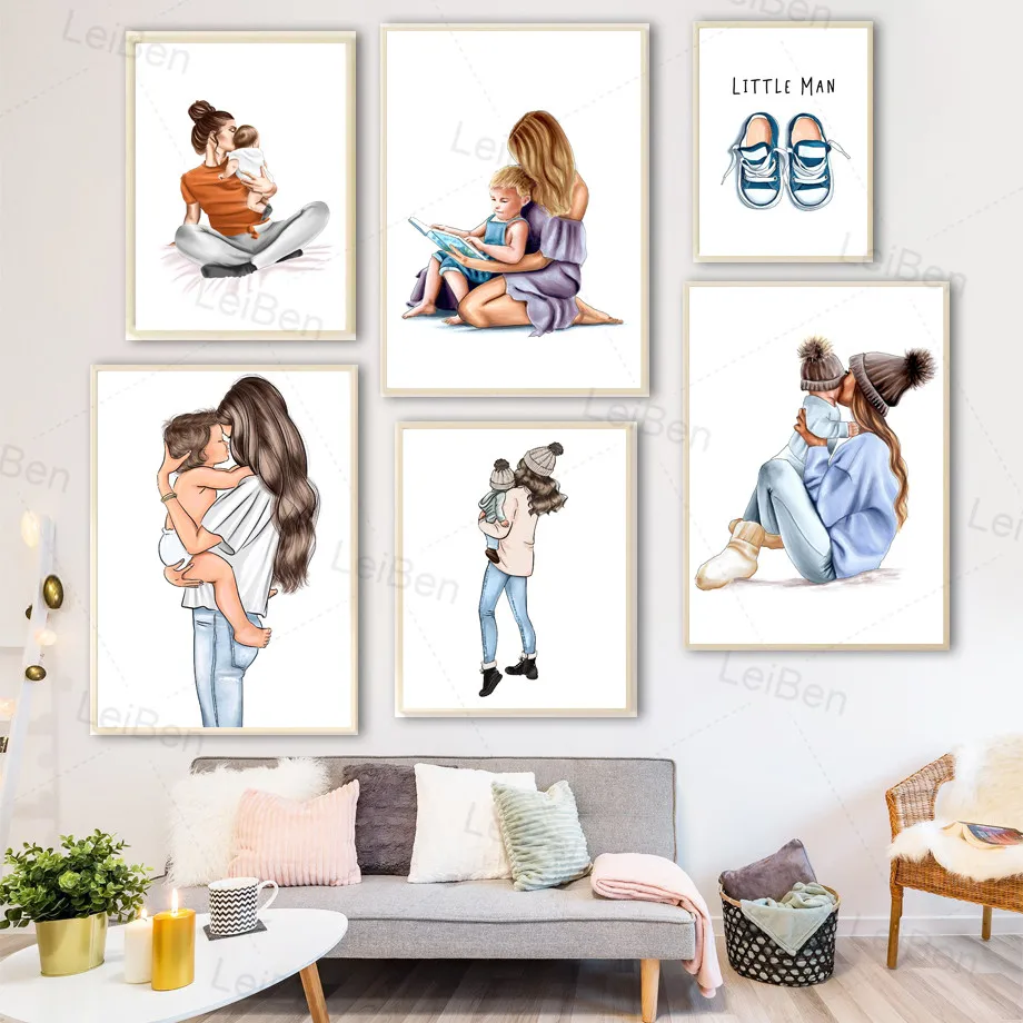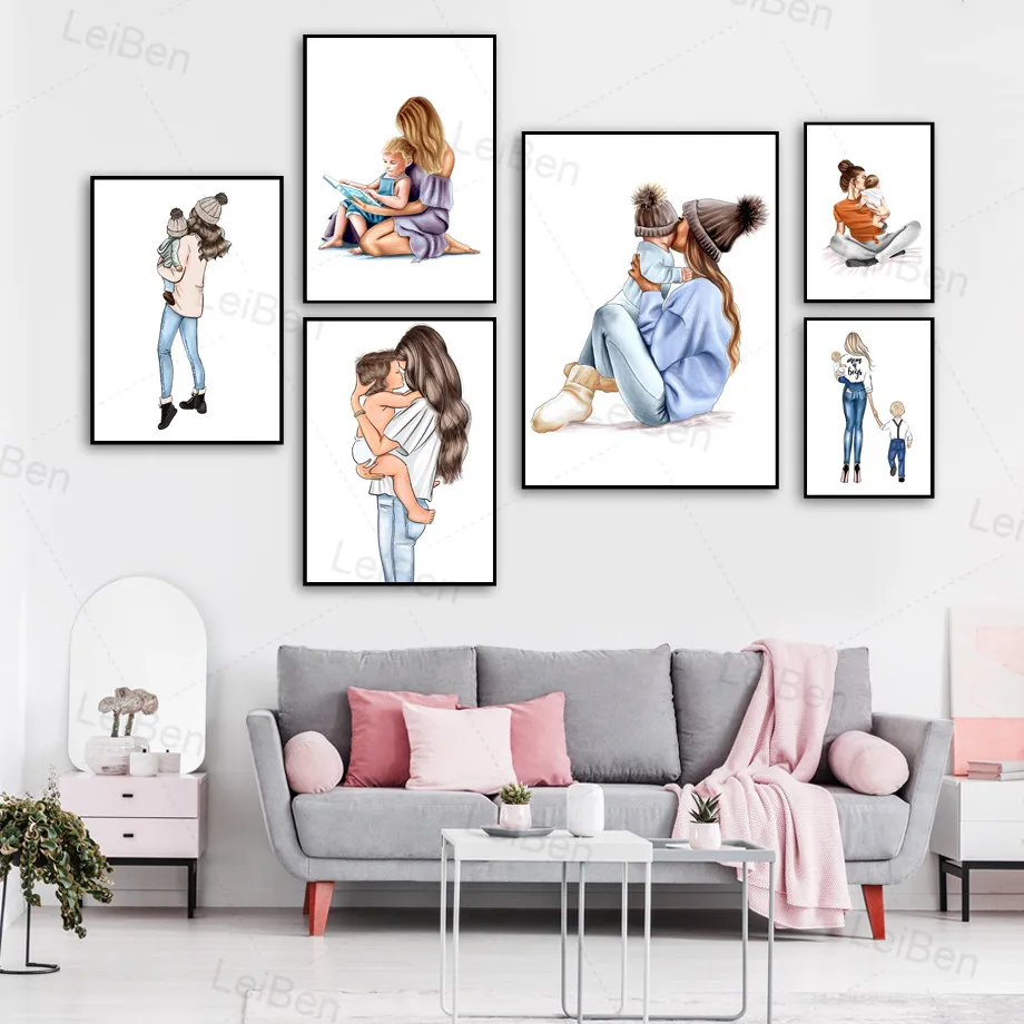 Картина на холсте с изображением семьи мамы и ребенка на заказ, художественный постер для повседневной жизни, украшение для дома, детская комната, картина в скандинавском стиле
