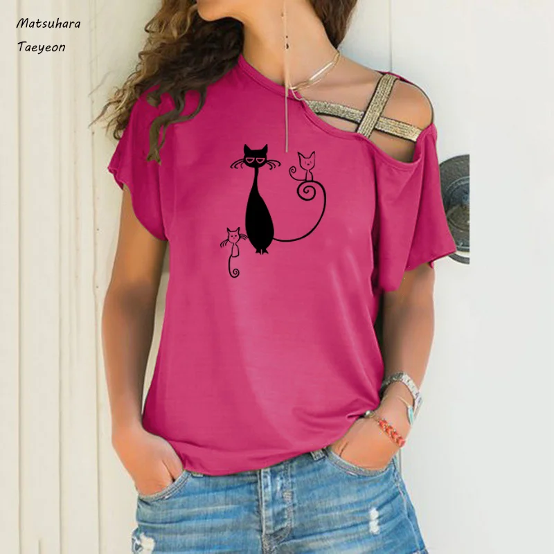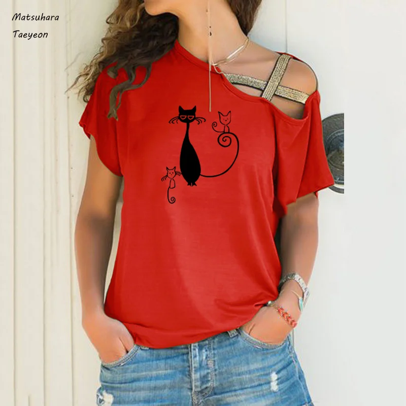 Женская хлопковая футболка, с коротким рукавом и принтом кота