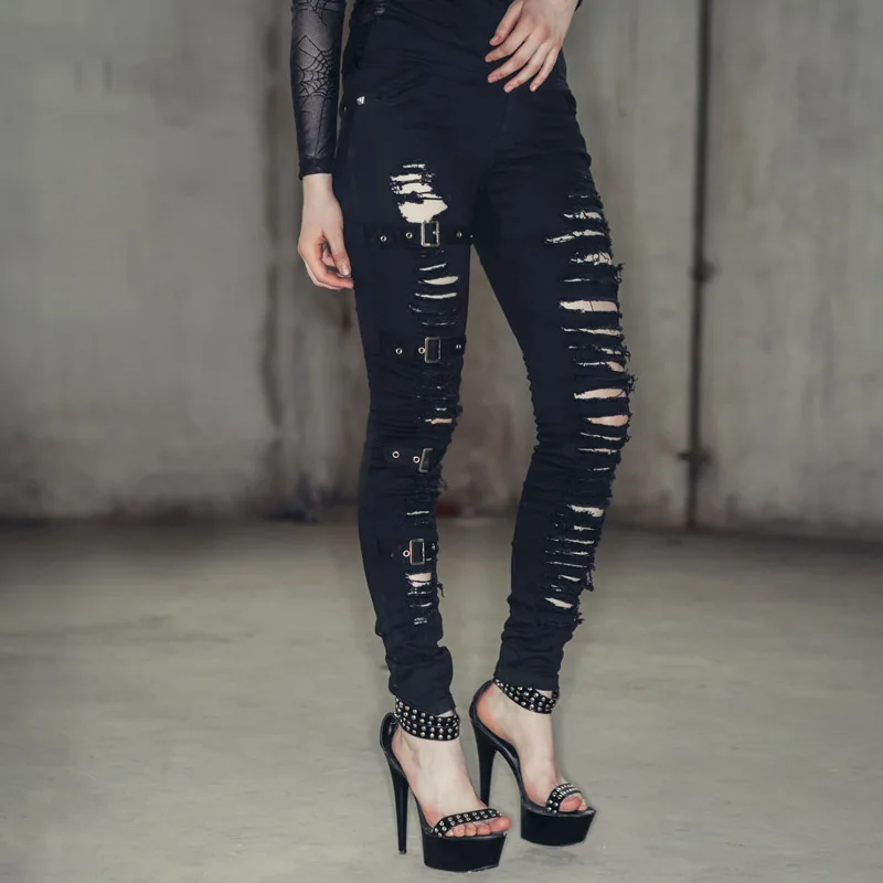 Черные женские брюки в стиле стимпанк из джинсовой ткани, зимние готические панковские облегающие длинные брюки с высокой талией и отверстиями, женские брюки