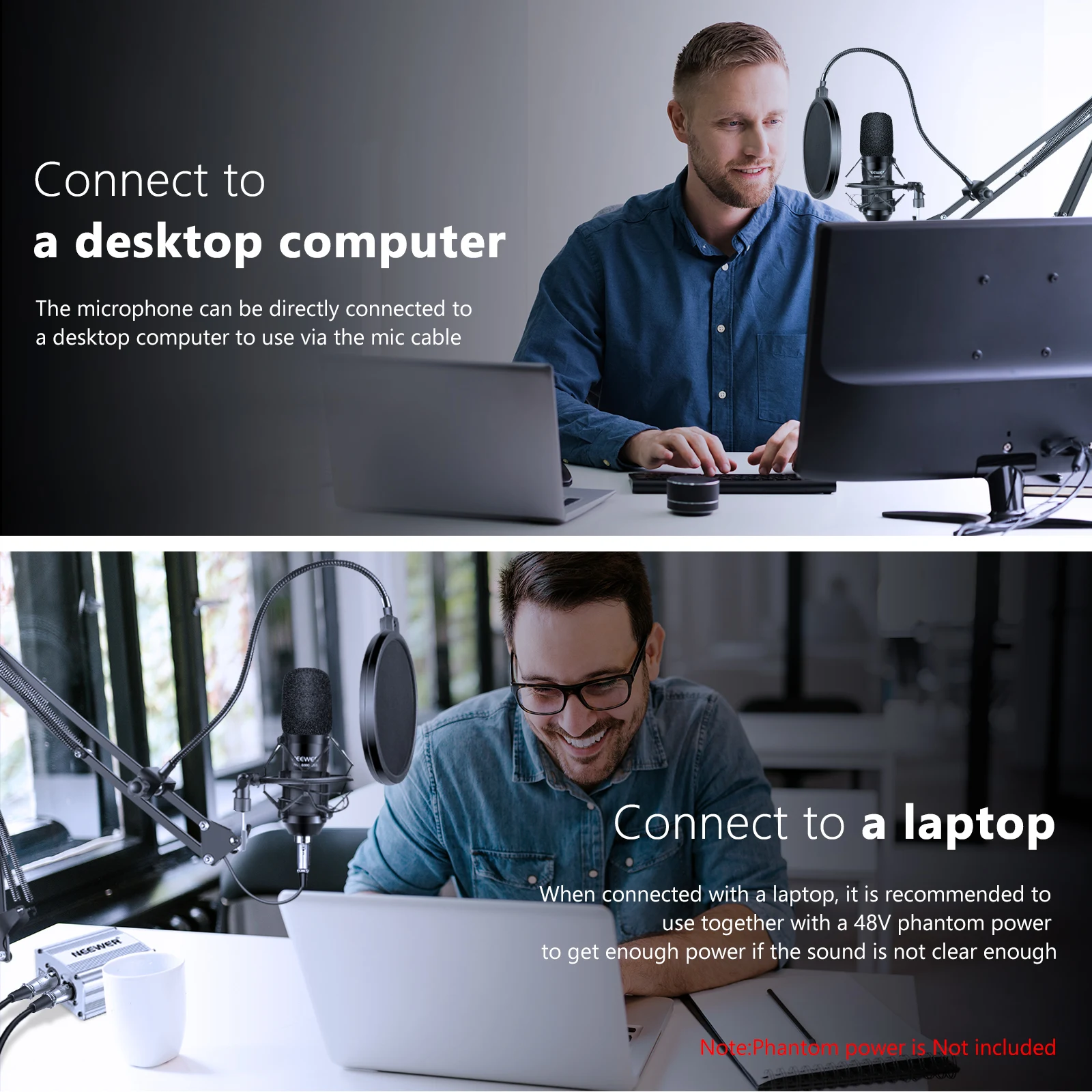 При подключении к ноутбуку, Подключите ноутбук к электрической розетке или используйте фантомную мощность 48 В, чтобы получить достаточно мощности, если звук недостаточно четкий и высокий.
