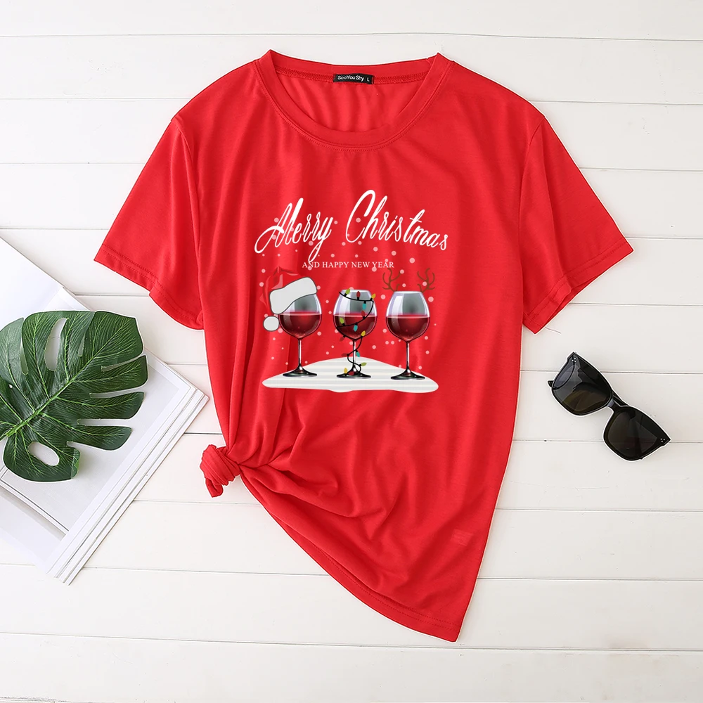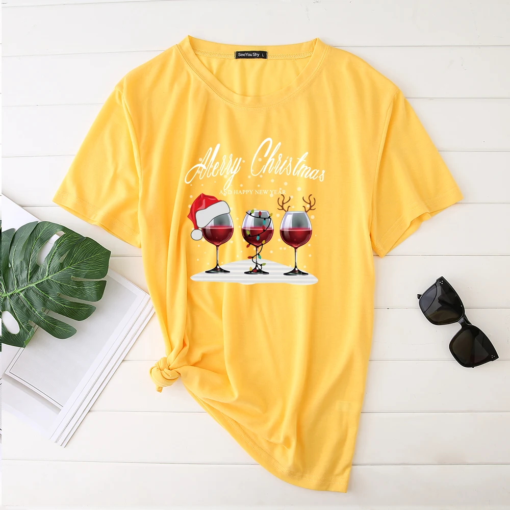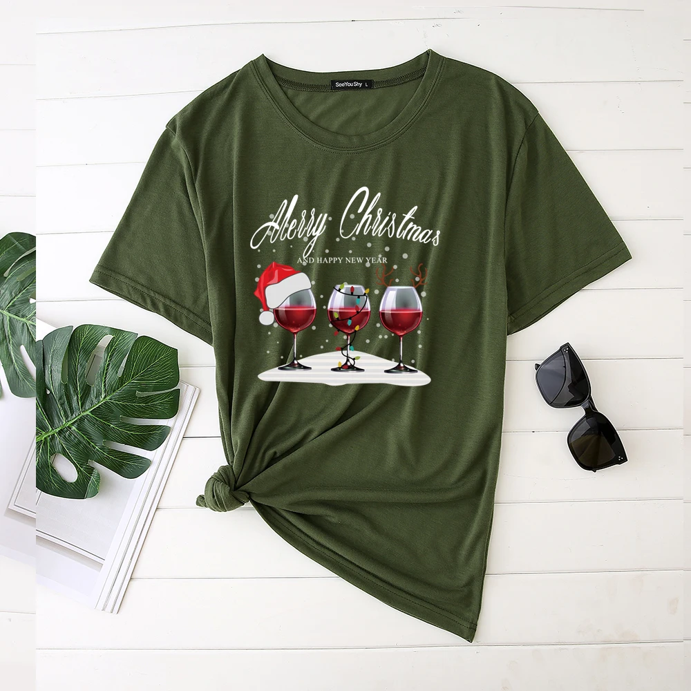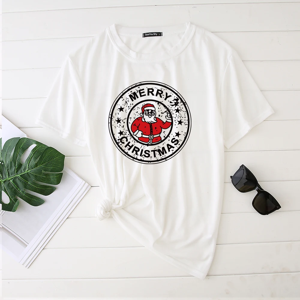 Футболки женские с рождественским принтом Seeyoushy, повседневные топы в стиле Харадзюку для девочек-подростков, хлопковые футболки с коротким рукавом, размера плюс