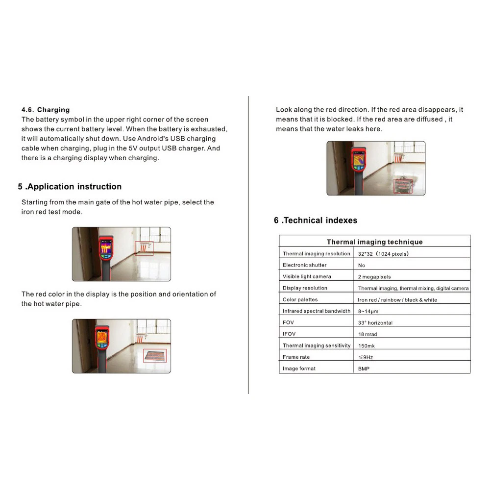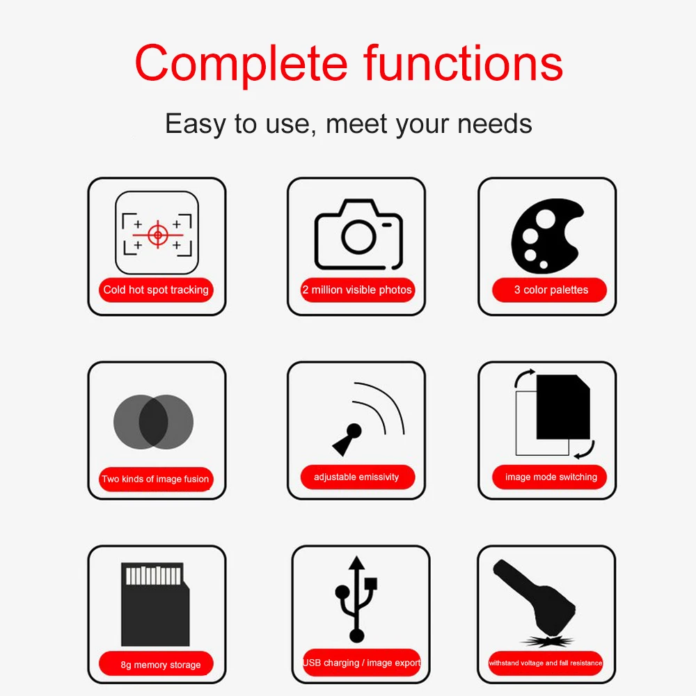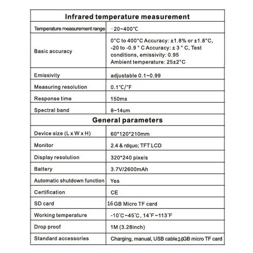 1. Высокое разрешение. Видимый свет 2 млн пикселей, 1024 пикселей теплового изображения хорошо видны; 2,3 режимов цветопередачи. Инструмент предоставляет 3 цветовые палитры: Железный красный, Радужный, черный и белый. Выберите подходящие цветовые палитры, чтобы показать детали цели; 3. Две функции изображения. Контурная линия и тепловизор, видимый свет и тепловизор; 4. Этот прибор поддерживает два визуальных режима переключения, которые можно сравнить в соответствии с двумя схемами измерения, чтобы найти точку неисправности. Это идеальный выбор для электриков и техников по обслуживанию и может быть использован для быстрого поиска проблемной области; 5. Большая емкость для хранения изображений. Стандартная 16 Гб мини-карта TF с большой емкостью может хранить различные изображения измерений; 6. USB для быстрого чтения изображений. Отснятые изображения, сохраненные в инструменте, можно просматривать и экспортировать, подключив к компьютеру, что удобно и быстро; 7. USB для быстрого чтения изображений. Отснятые изображения, сохраненные в приборе, можно просмотреть и экспортировать, подключив к компьютеру, что удобно и быстро. Спецификация Размер оборудования: 60*120*210 мм Тип дисплея: 2,4 дюйма TET LCD Разрешение дисплея: 320*240 пикселей Аккумулятор: 3,7 в/2600 мАч Функция автоматического отключения: Да Сертификация: CE Карта памяти: 16 Гб mini tf-карта Рабочая температура: от-10C до 45 °C, от 14 до 113 °F Испытание на падение: Рассчитано на 1 метр, (3,28 футов)Комплектация: зарядная головка, руководство, кабель для передачи данных, 16 ГБ мини-карта TF