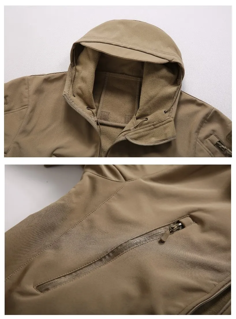 Мужская флисовая куртка в стиле милитари, теплая ветрозащитная водонепроницаемая куртка с капюшоном из мягкой кожи акулы, тактическая походная куртка