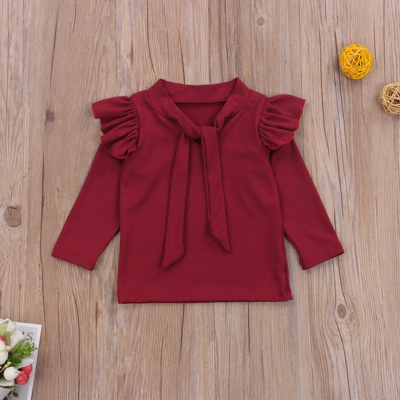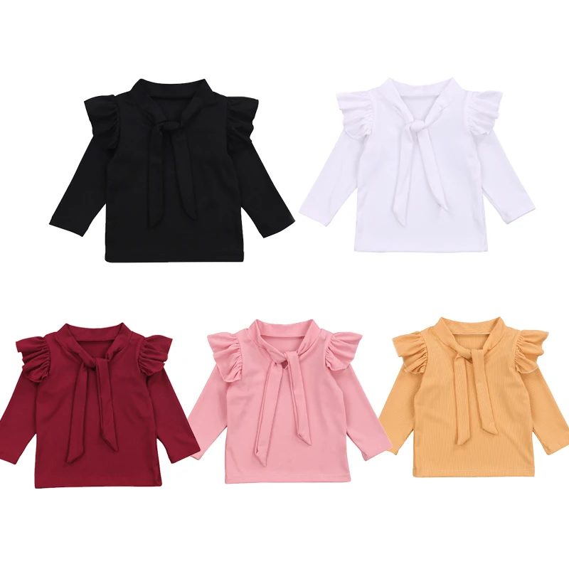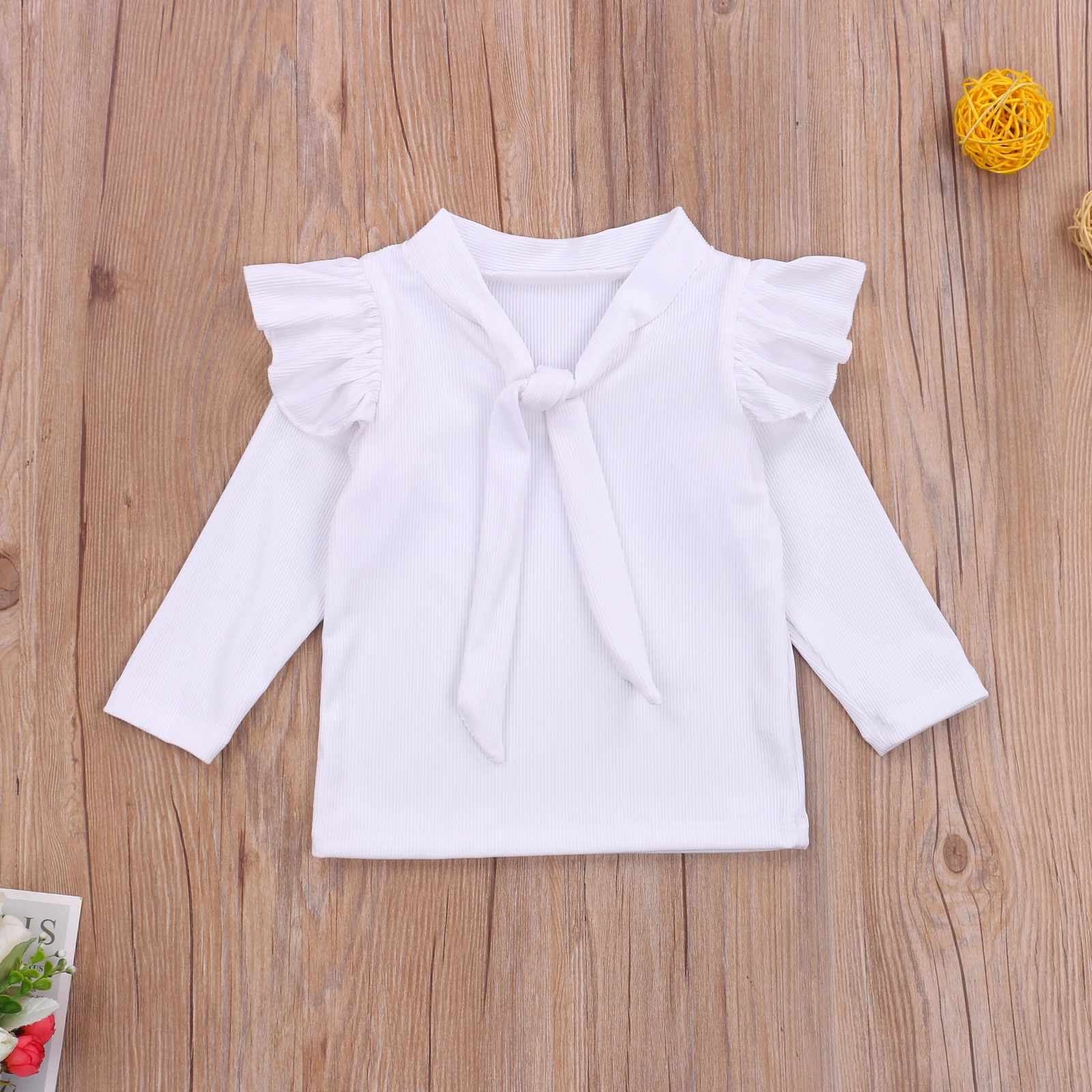 Детские Осенние футболки для девочек, однотонные пуловеры с оборками и длинным рукавом, с воротником-бантом, топы, 1-5 лет
