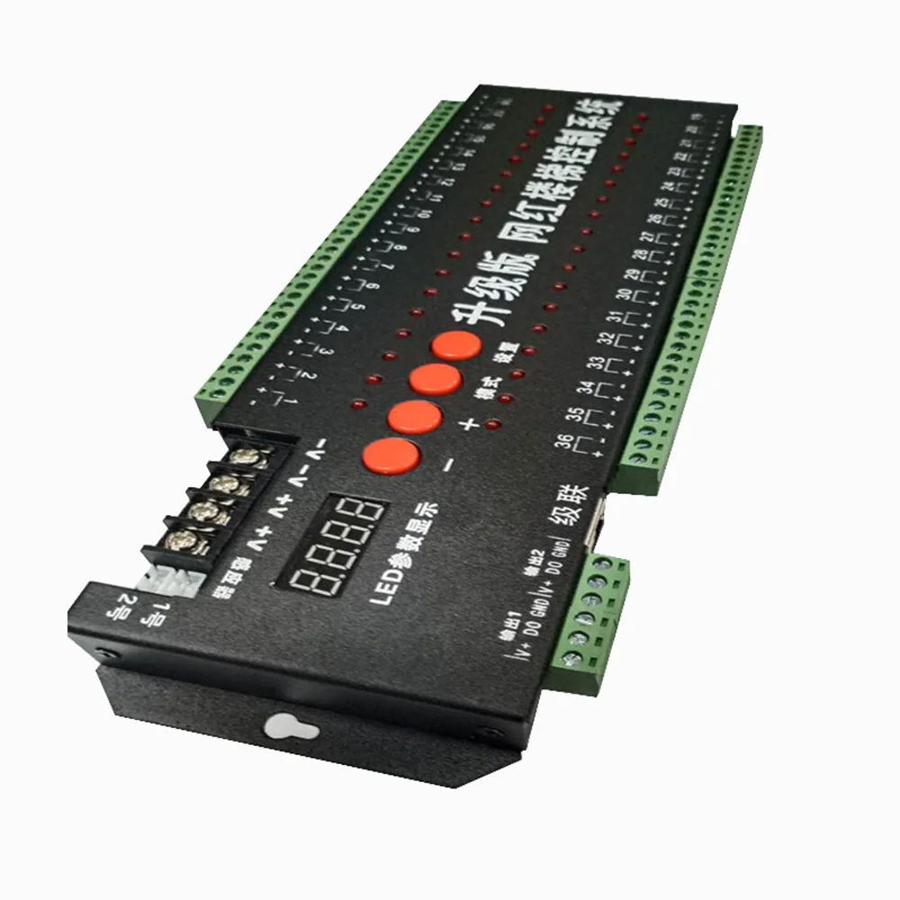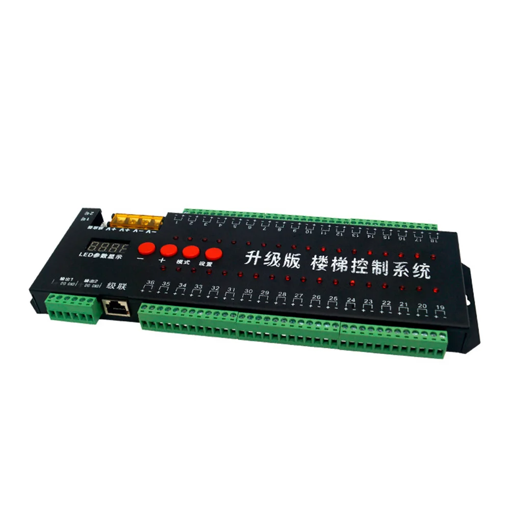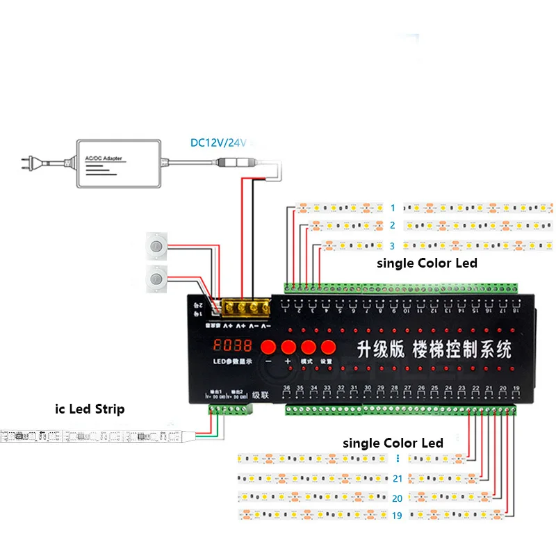 36 индукционных светодиодный функциональных светодиодных контроллеров очень разнообразны, поэтому нужно настроить только некоторые основные функции и эффект после их интеграции внутри, если вам нужны другие функции и эффекты, контроллер индукционного интерфейса с 2 входами для дороги может соответствовать большинству общих датчиков на рынке, Например, модуль индукции человеческого тела PIR, емкостный модуль датчика, модуль датчика вибрации, модуль инфракрасного датчика, трубка близка к индукционному модулю, система управления может управлять в двух видах светодиодный свет, является своего рода поддержка общего SPI: Единичная Волшебный фонарь, Такие как 1903190 общего светодиодный производителей продукции,1912181 2281 1167 03281 3820 5820 6 чипов полный Точечный светильник Видимый светильник Волшебный ремень для фонарика магии фонарь продуктов, система управления и левом нижнем углу DO1 GND, DO2, GND с двухсторонним параллельные выходные клеммы, может удовлетворить изделие лампа светильник левые и правые стороны лестницы, Еще одним выходом является 36 ступенек с использованием монохромного светильник, количество ламп можно регулировать, если через Каскадный портовый усилитель ступени увеличить количество лестниц более 36 шагов, можно увеличить.Контроллер выбирает настройки функции контроллера индукции, нажав на кнопку.Настройки отображаются через четыре лампочки слева.