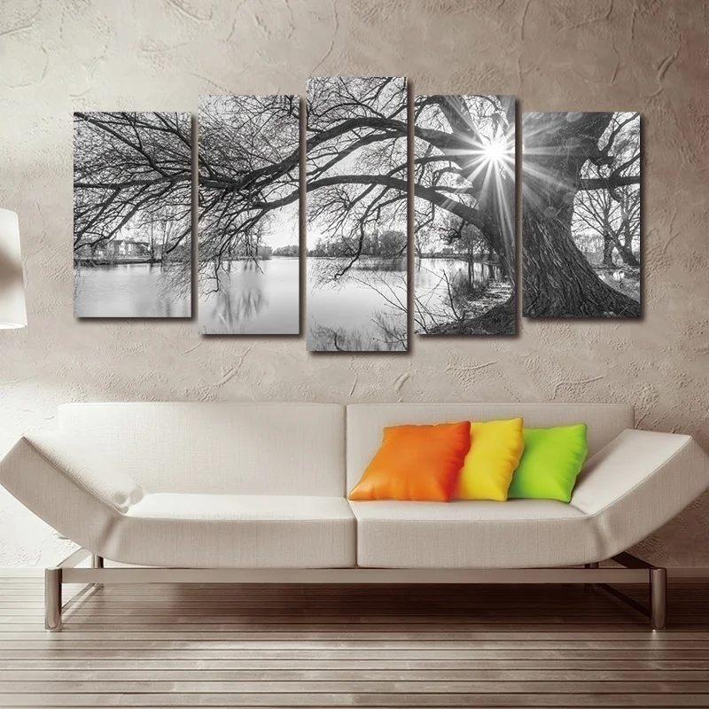 Модульный холст HD ПЕЧАТЬ Плакаты домашний декор настенные художественные картины черно-белое дерево силуэт в восходе солнца 5 панелей картины