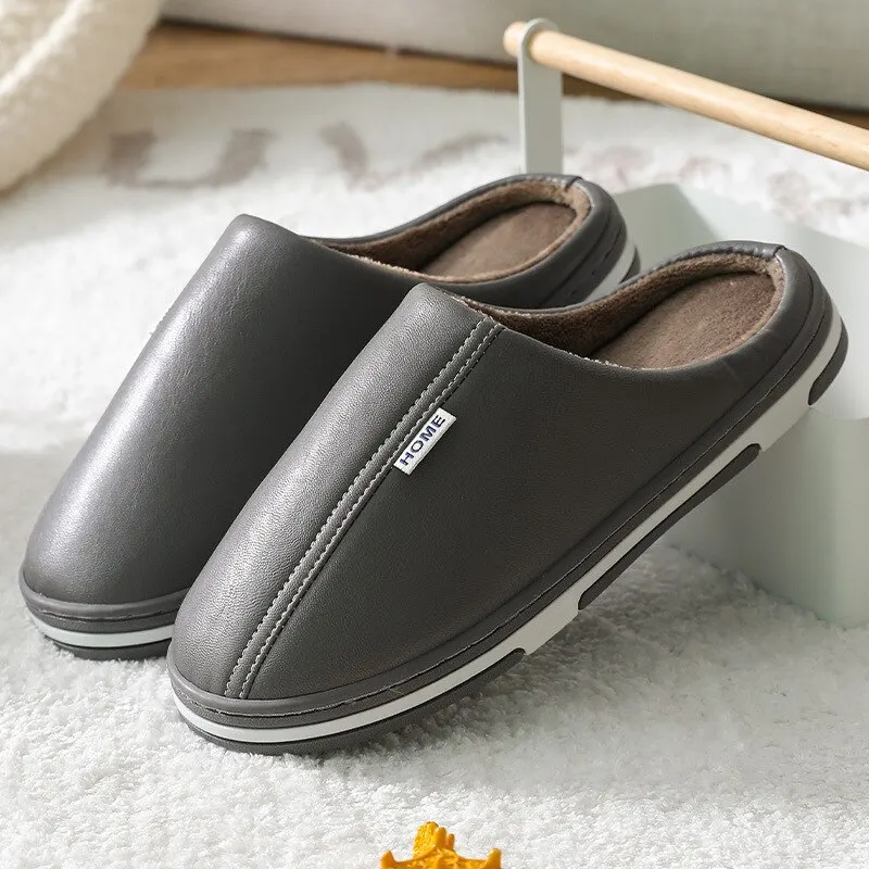 Мужские и женские шлепанцы новые зимние тапки из кожи пу; Теплые комнатные тапочки Водонепроницаемый; Домашняя обувь для мужчин; Теплые кожаные туфли без шнуровки