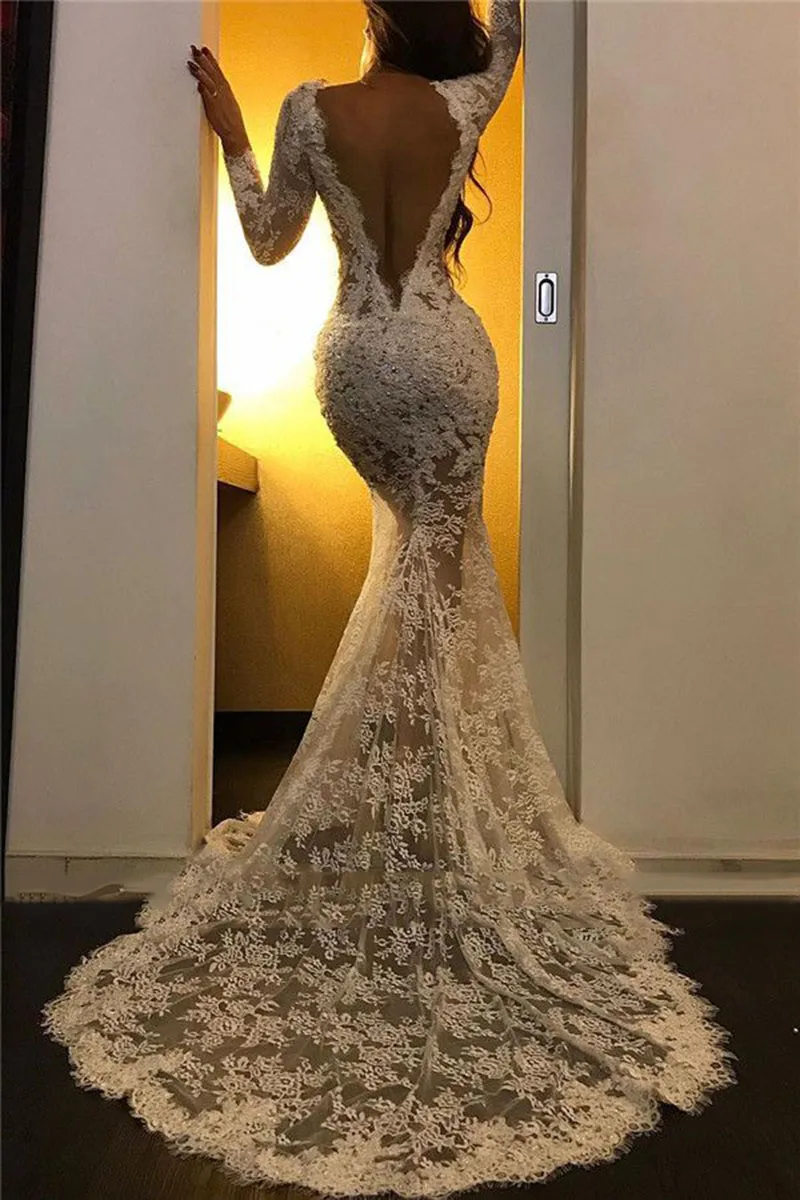 Женское свадебное платье с длинным рукавом, открытой спиной и V-обр...