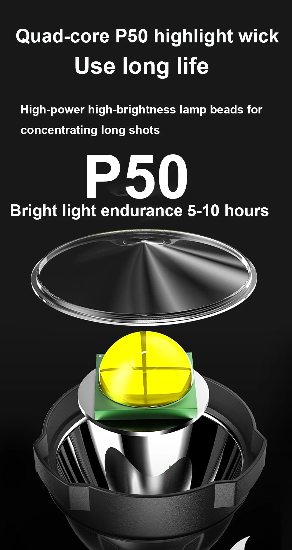 Фитиль: P50 Водонепроницаемость: водонепроницаемый уровень жизни Срок службы батареи: 5-10 часов Материал: АБС-пластик высокой твердости Аккумулятор: встроенный аккумулятор Светильник источник света: белый светильник Зарядка: многофункциональная зарядка Фокус: без фокуса Положение шестерни: сильный-средний-слабый-стробоскоп Линзы: линзы из смолы
