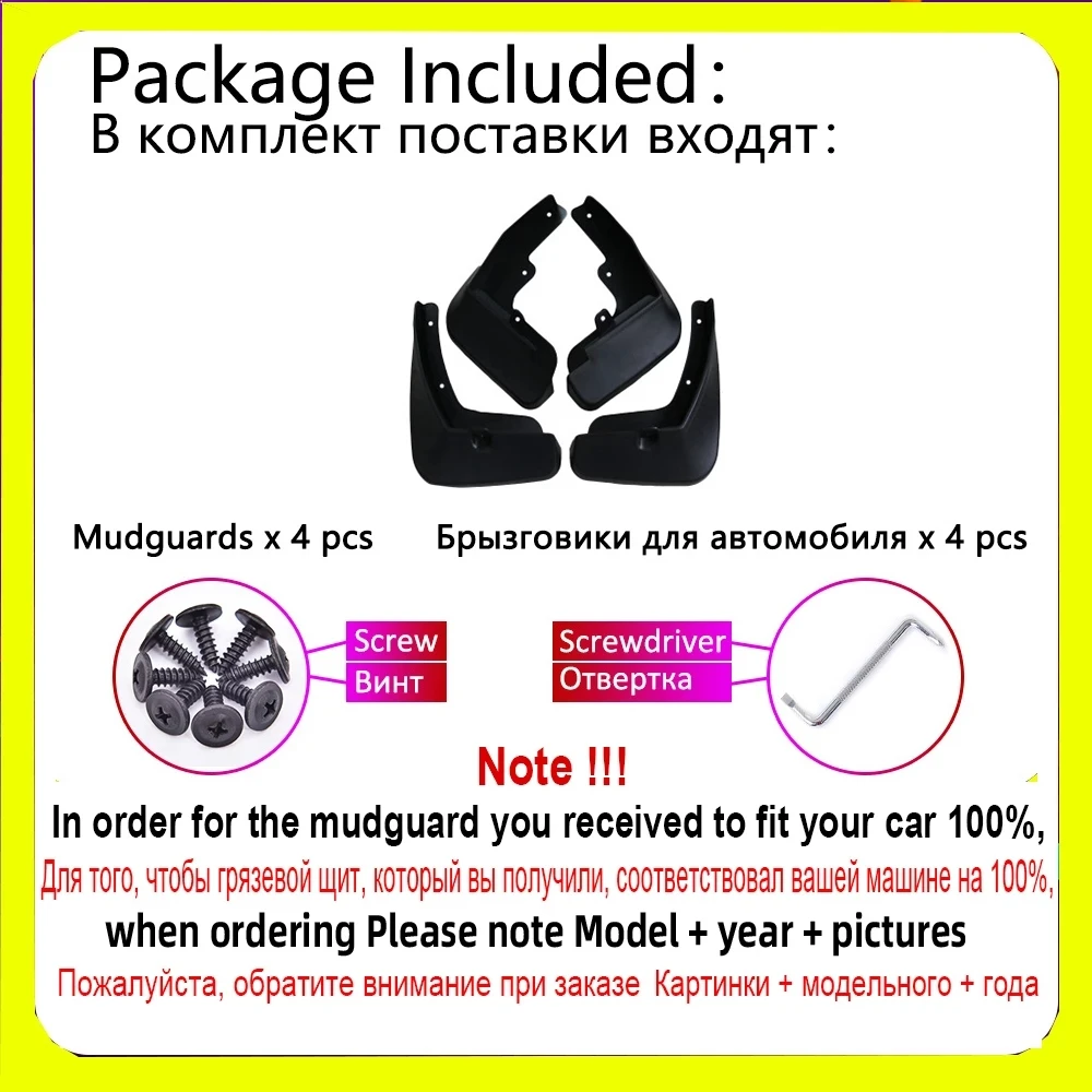 Эти износостойкие грязезащитные ограждения легко сочетаются со стилем автомобилей и минимизируют риск грязи, дорожного мусора и каменных сколов, летающих вверх с передних и задних шин. Обеспечьте дополнительную защиту, улучшая спортивный внешний вид вашего автомобиля Инструкции по установке: 1. Автомобиль в нижней части оригинального винты для автомобилей с ключом для завинчивания 2. Возьмите Брызговики, хорошее расположение, винты установлены 3. Винты, установленные в соответствующее отверстие на брызговиках.