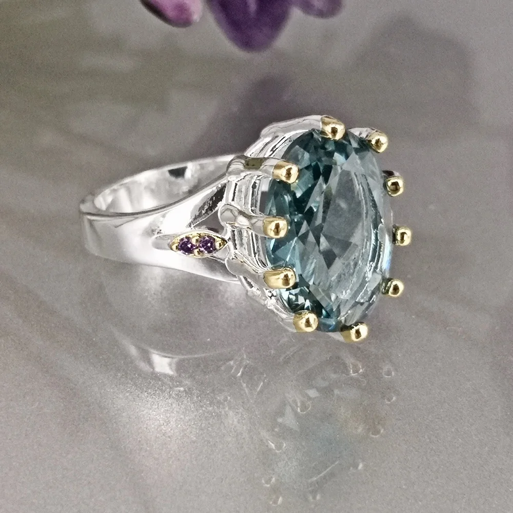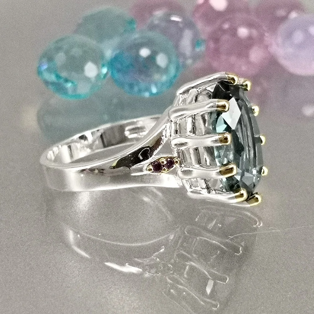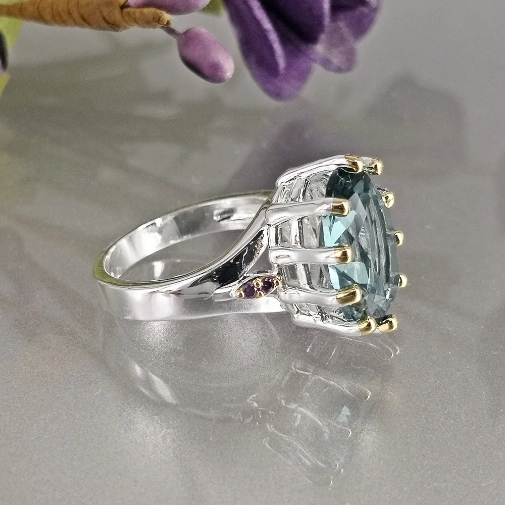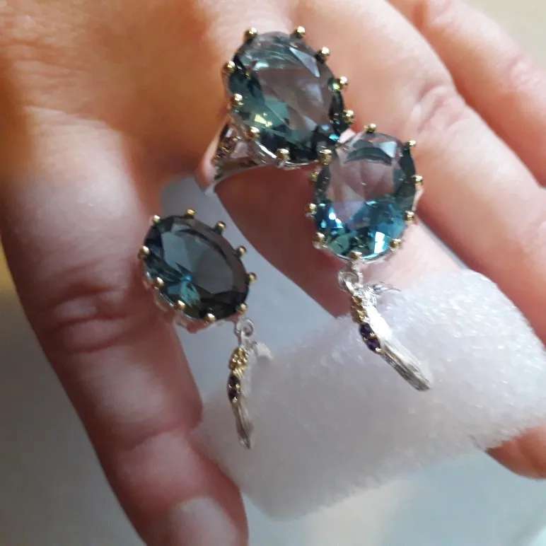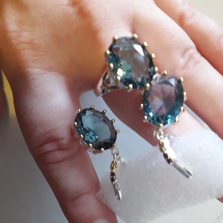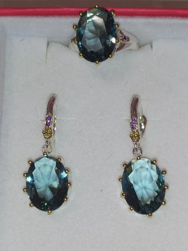 Это фантастические украшения, шикарное кольцо, довольно крупные камни кристального голубого цвета в сочетании с маленькими фиолетовыми выглядят волшебно. Очень притягательны, так и хочется их надеть. Восторг! Спасибо любимому магазину DreamCarnival!