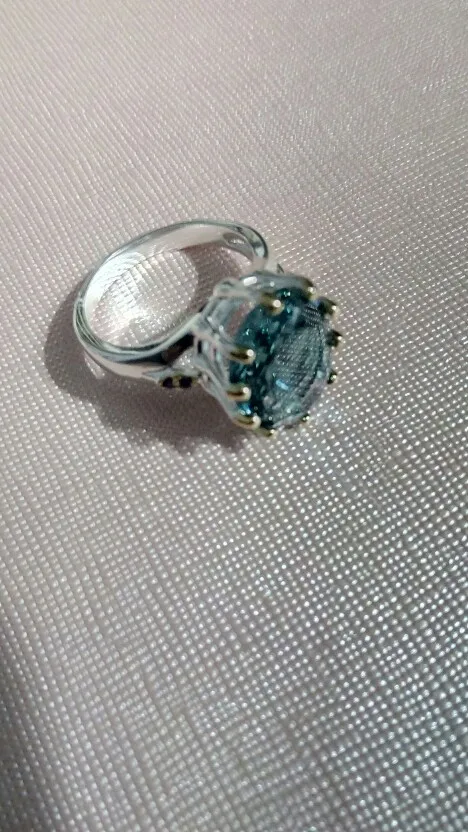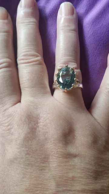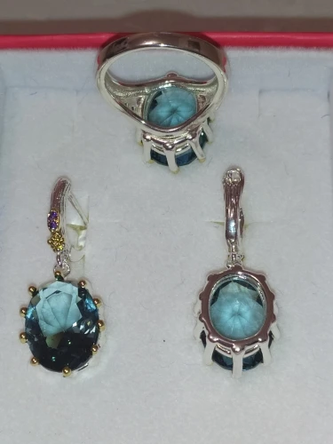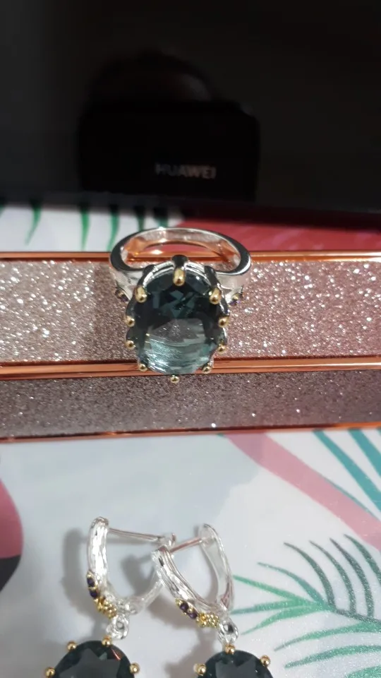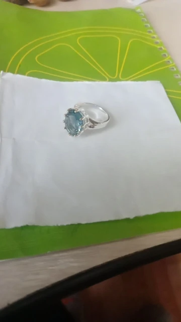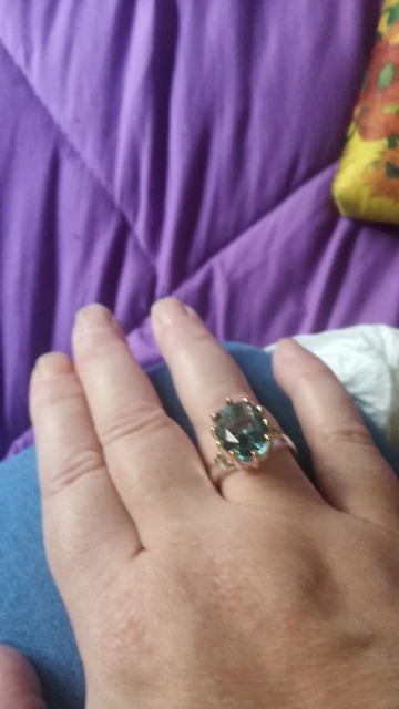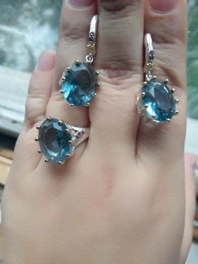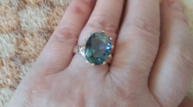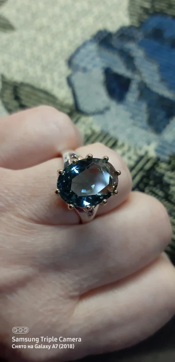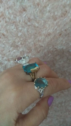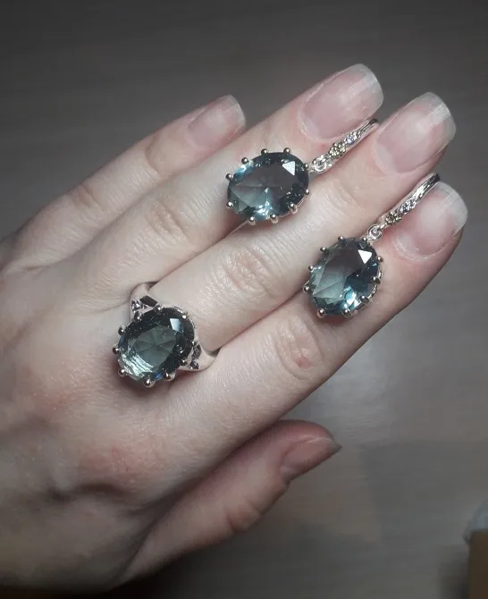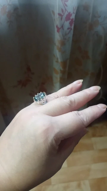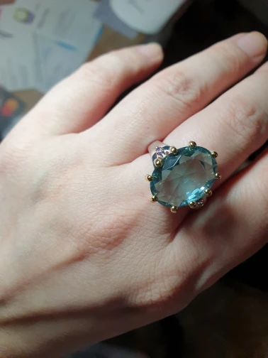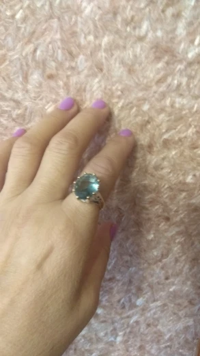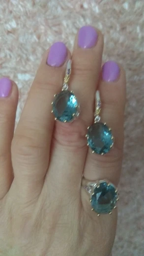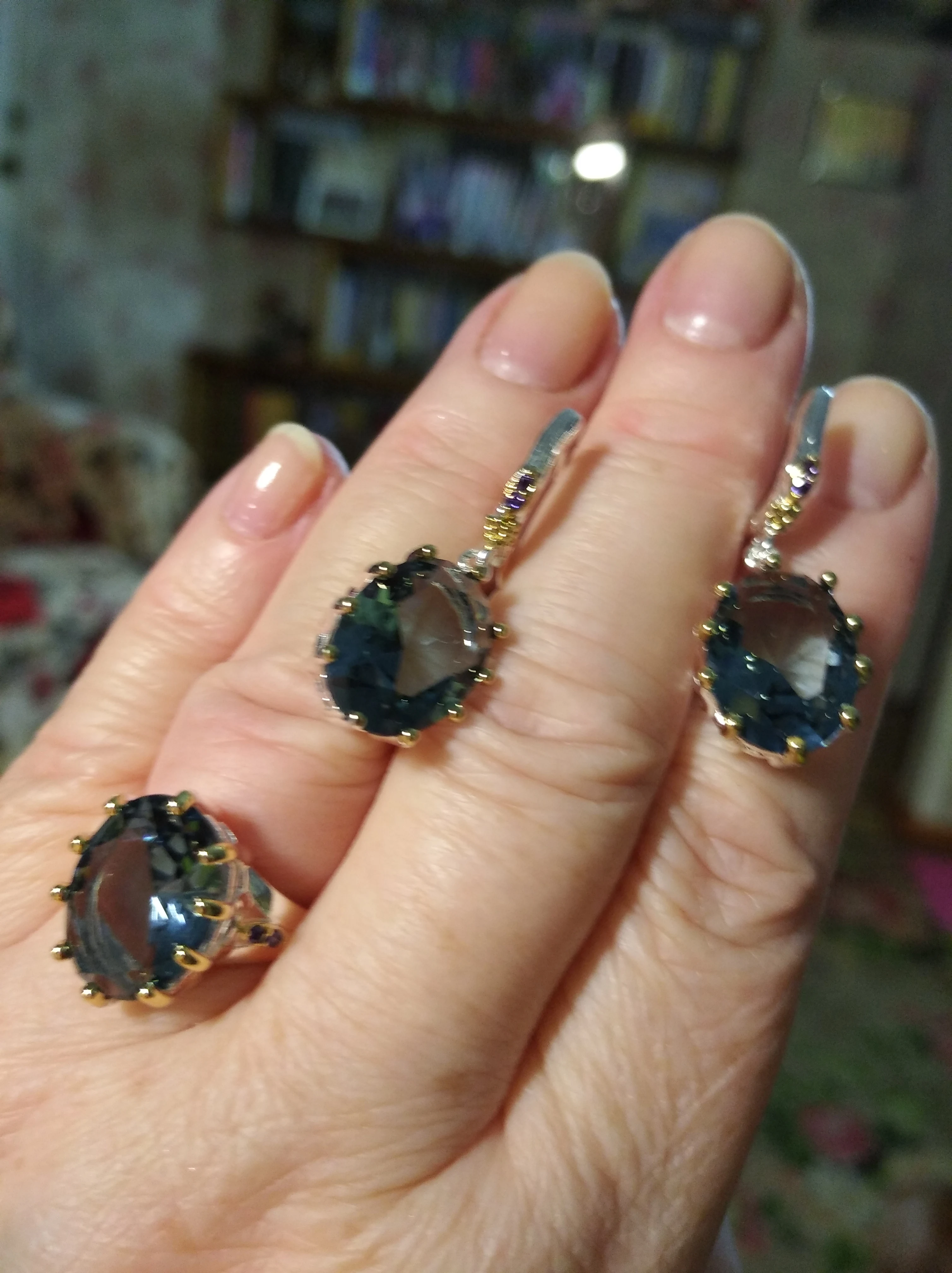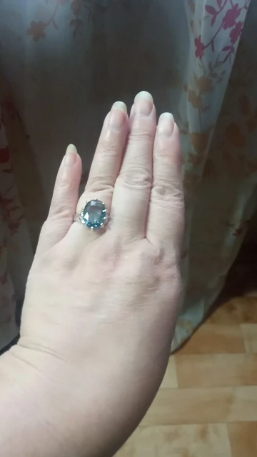 Брала кольцо в комплекте с серьгами. Мне всё в нём понравилось. Цвет камня необычный, прозрачный, красиво сверкает. Размер не сильно большой, но и немаленькие. Само кольцо немножко маломерит,примерно на полразмера.